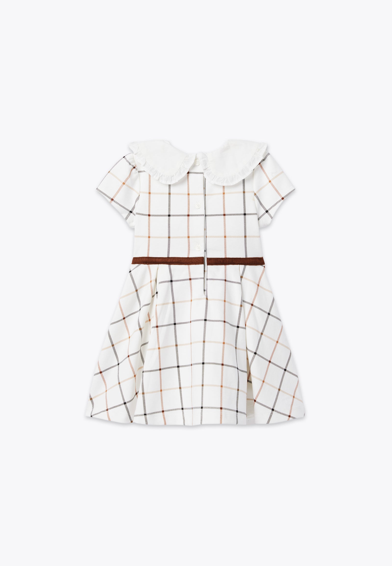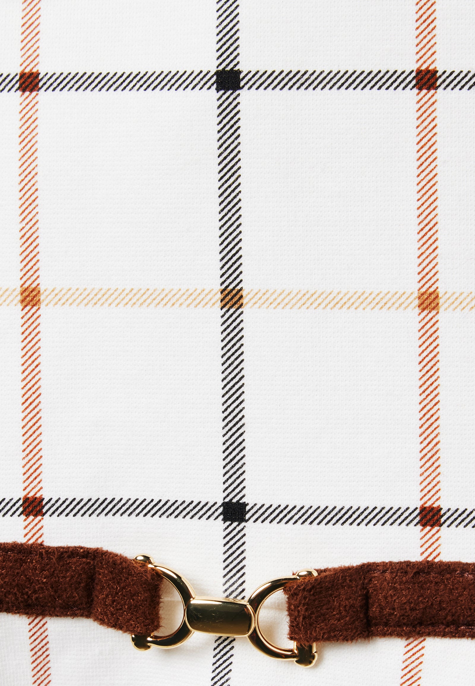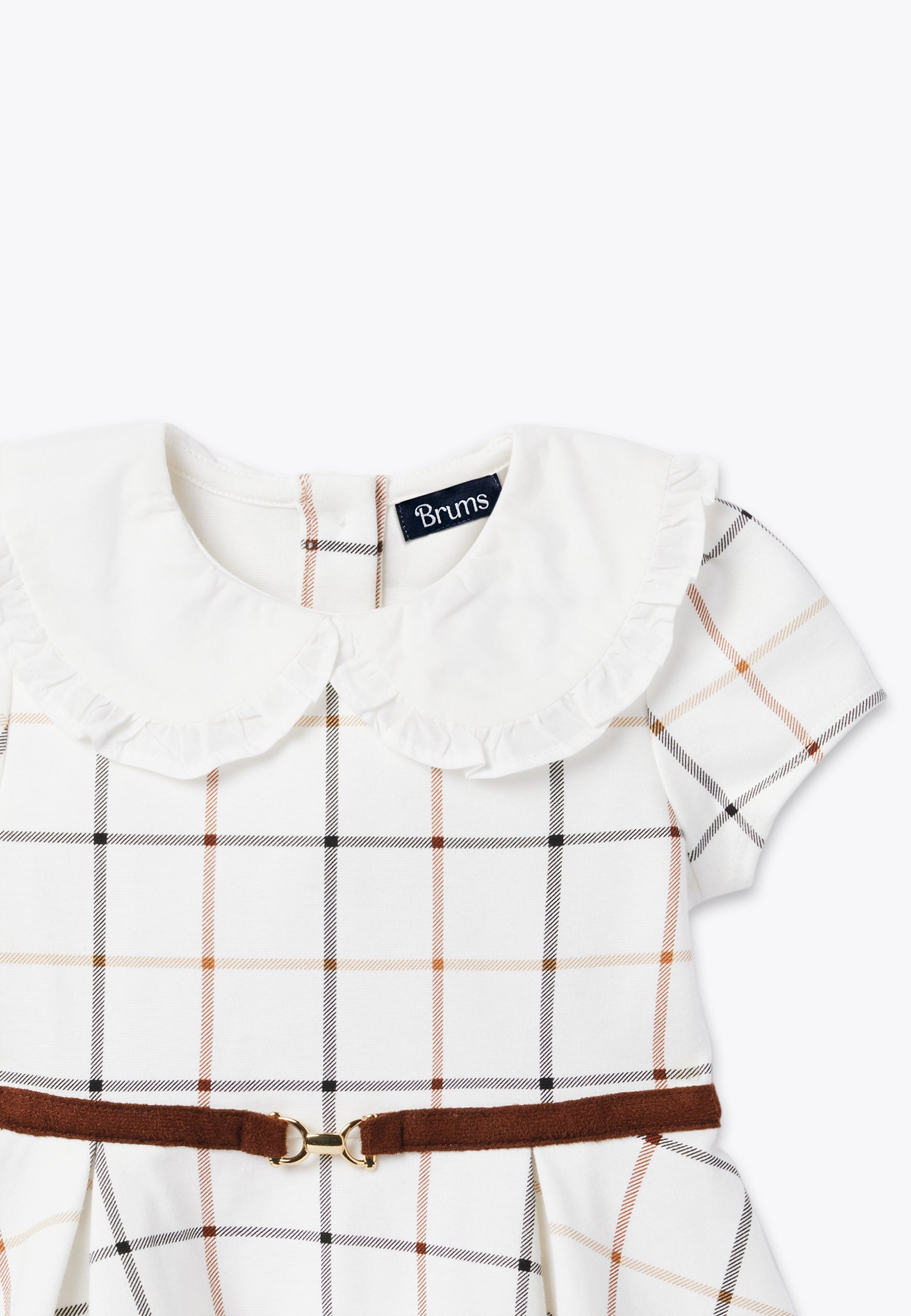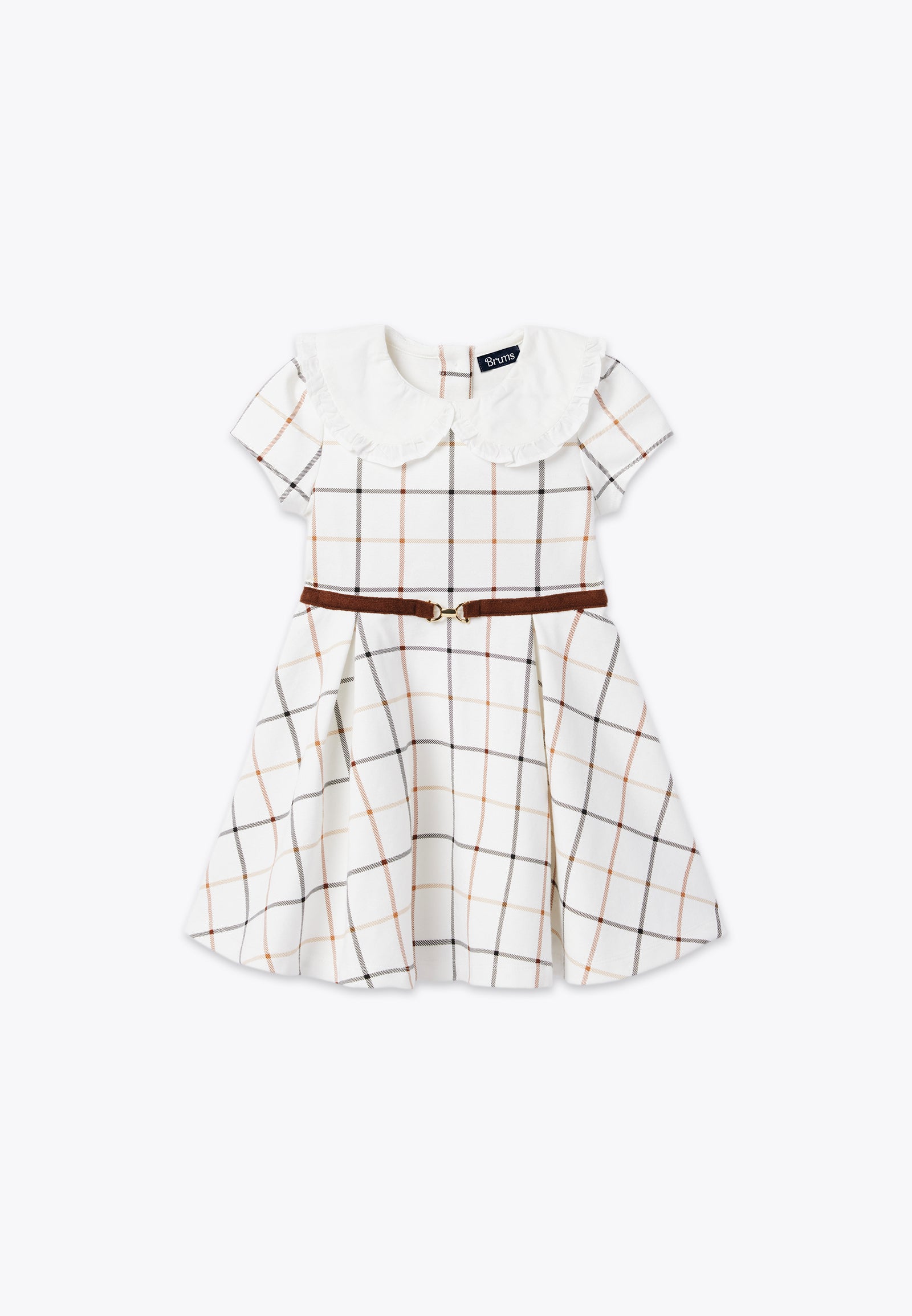Abito fantasia a quadri. Morbido e dall'aspetto accogliente, un vestito in maglia a quadri perfetto per ogni occasione che presenta un dolce collo alla Peter Pan e il dettaglio di una fibbia in vita dall'ispirazione equestre. Disponibile in bianco con motivo a quadri.