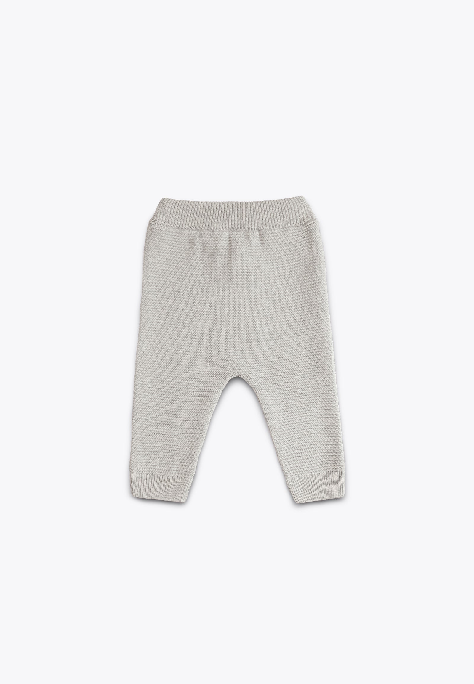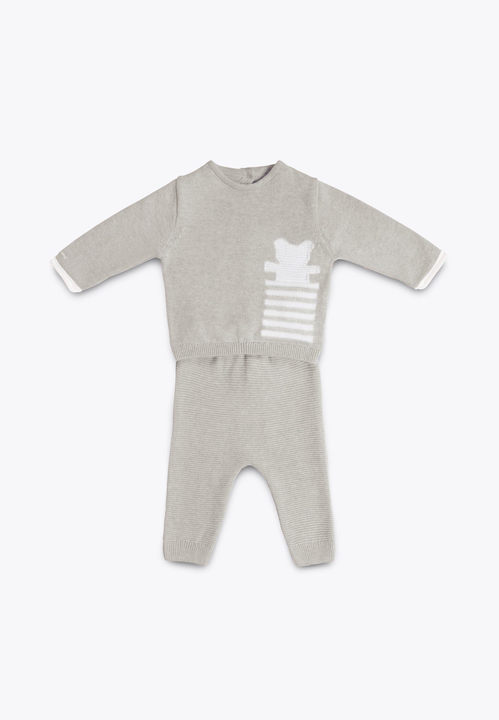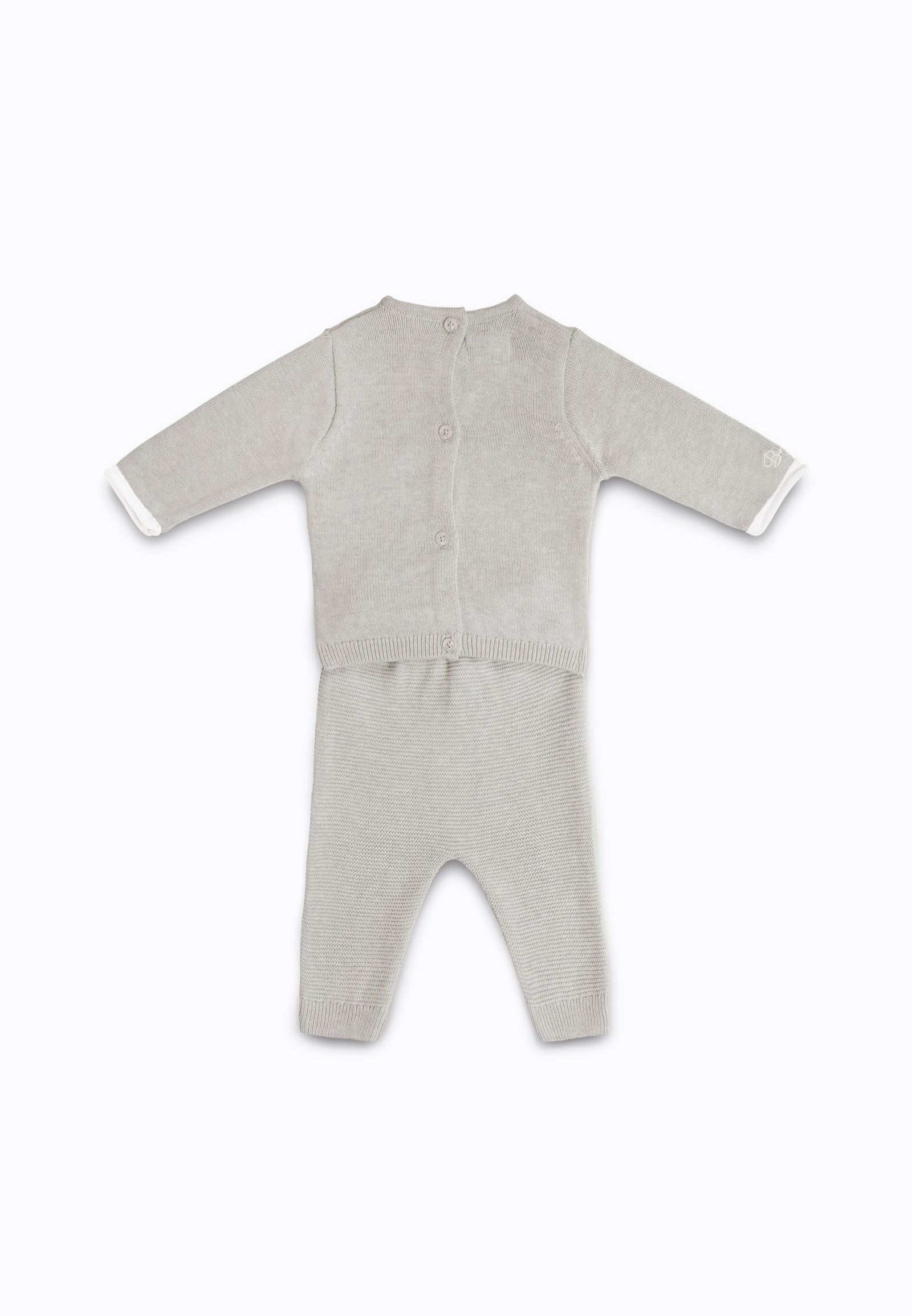 Completo beige (unisex): giro collo, lavorazione in maglia rasata per il top, lavorazione in maglia di riso per i pantaloni, polsini con rollino a contrasto bianco, fondo capo in costina, intarsio jacquard con orsetto a righe, ricamo Brums sulla manica, apertura sul retro con bottoni ad asola personalizzati Brums Milano in imitazione madreperla, vita elasticata dei pantaloni, polsini dei pantaloni in costina