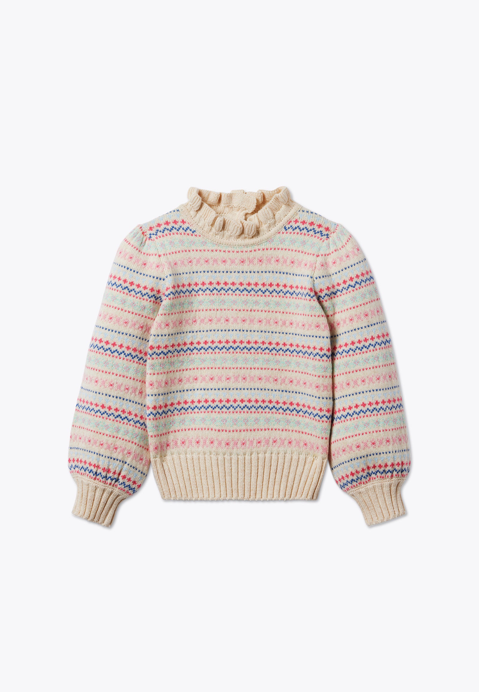 Lupetto in maglia jacquard. Un simpatico top dal colore classico e dal ricamo natalizio per accompagnare la tua piccola nelle occasioni importanti: perfetto per un clima di festa in modo da donare quel tocco di brio richiesto per brillare. Disponibile in beige con fantasia multicolor.