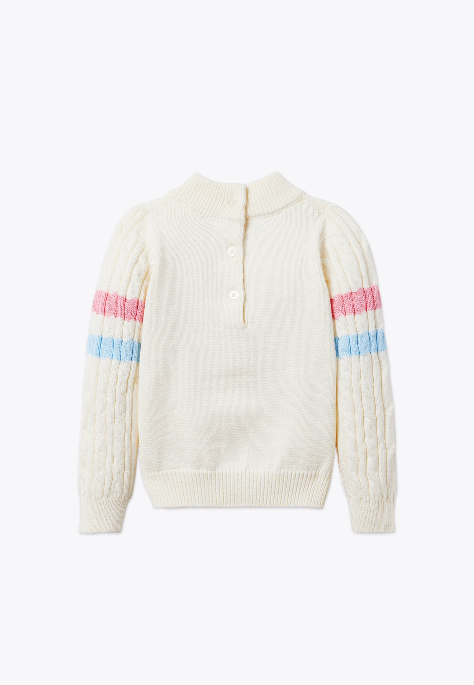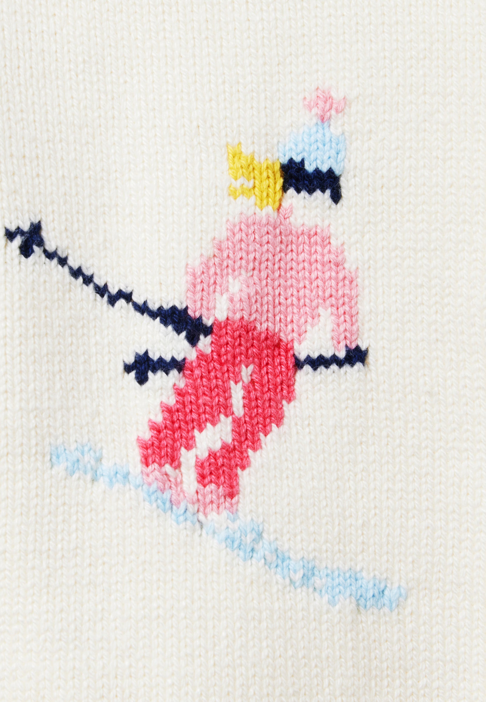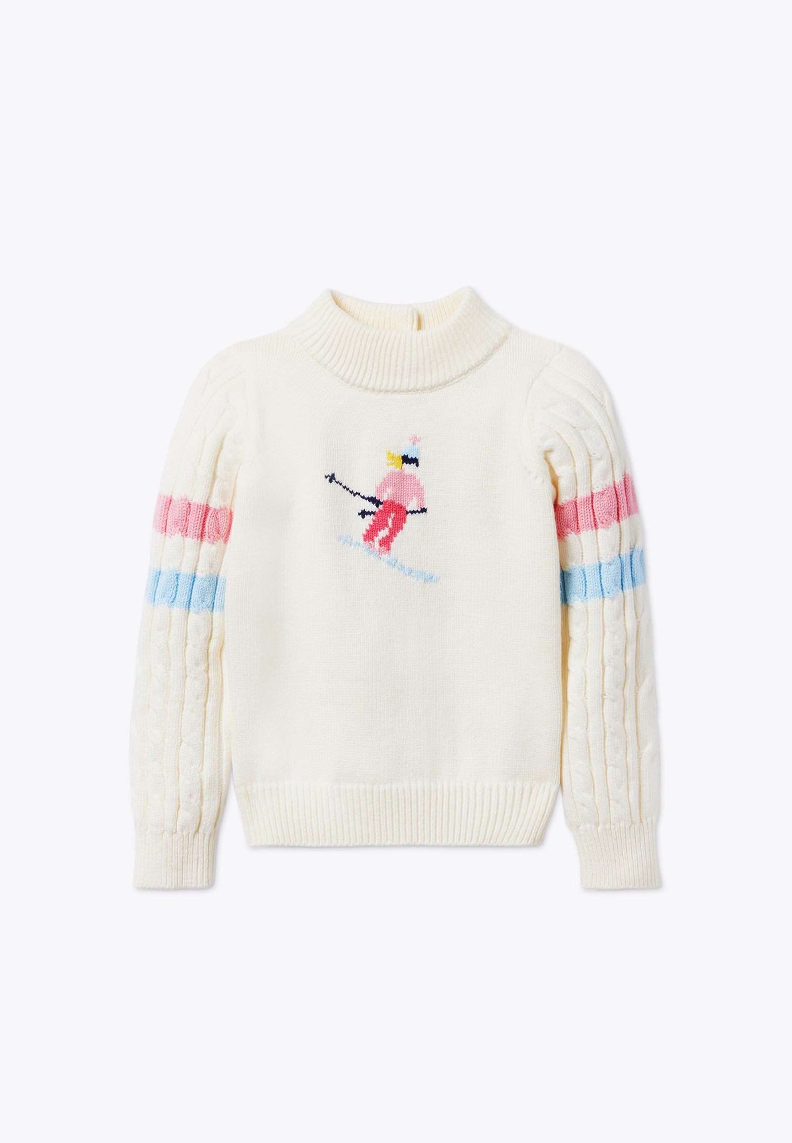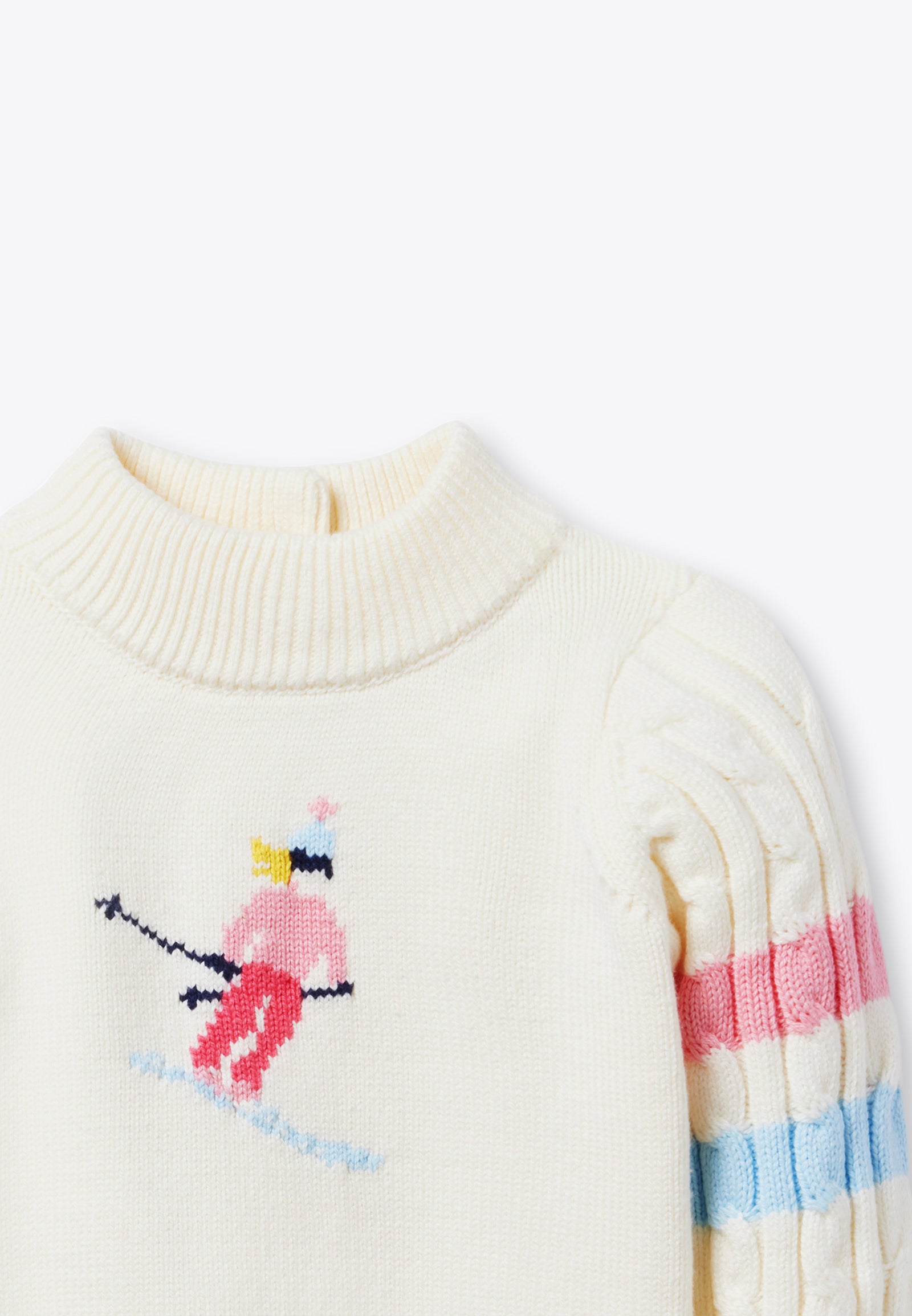 Maglione con intarsio sciatrice. Un simpatico top dal colore classico e dal ricamo natalizio per accompagnare la tua piccola nelle occasioni importanti: perfetto per una divertentissima settimana bianca - così come per il Natale - donerà quel tocco di brio richiesto per brillare. Disponibile in panna con dettagli rosa e azzurri.