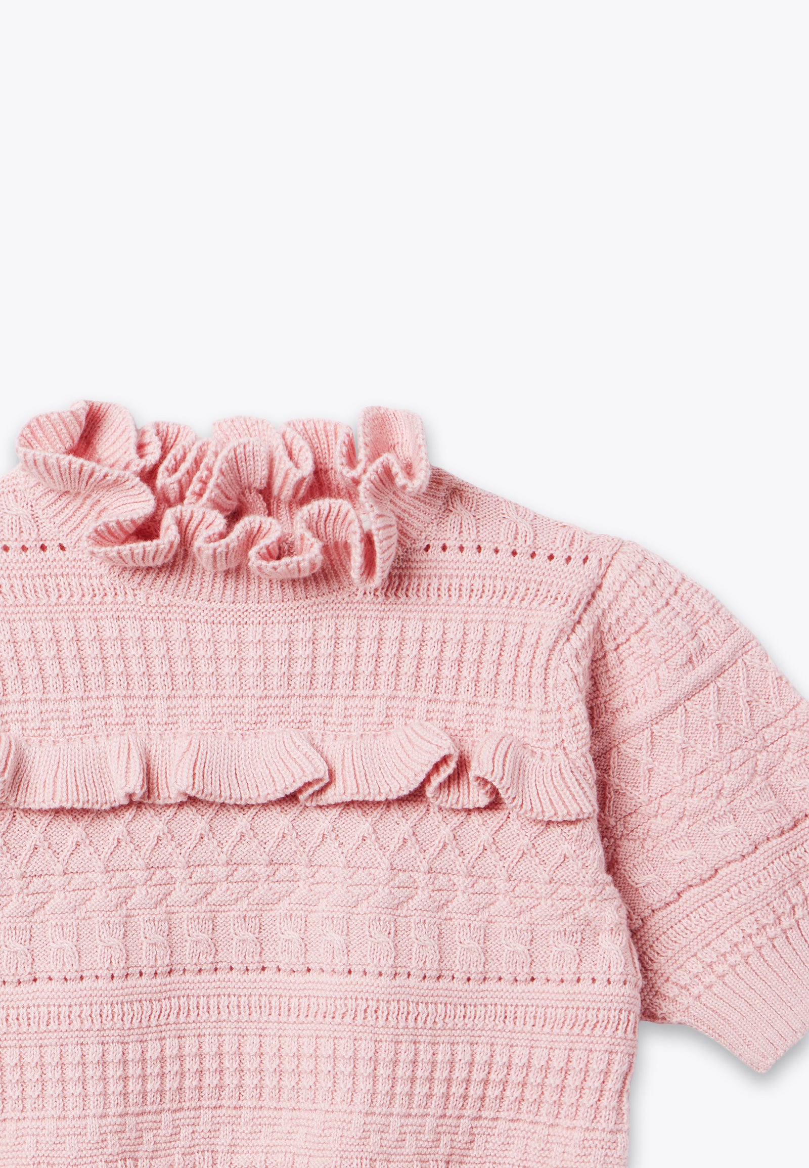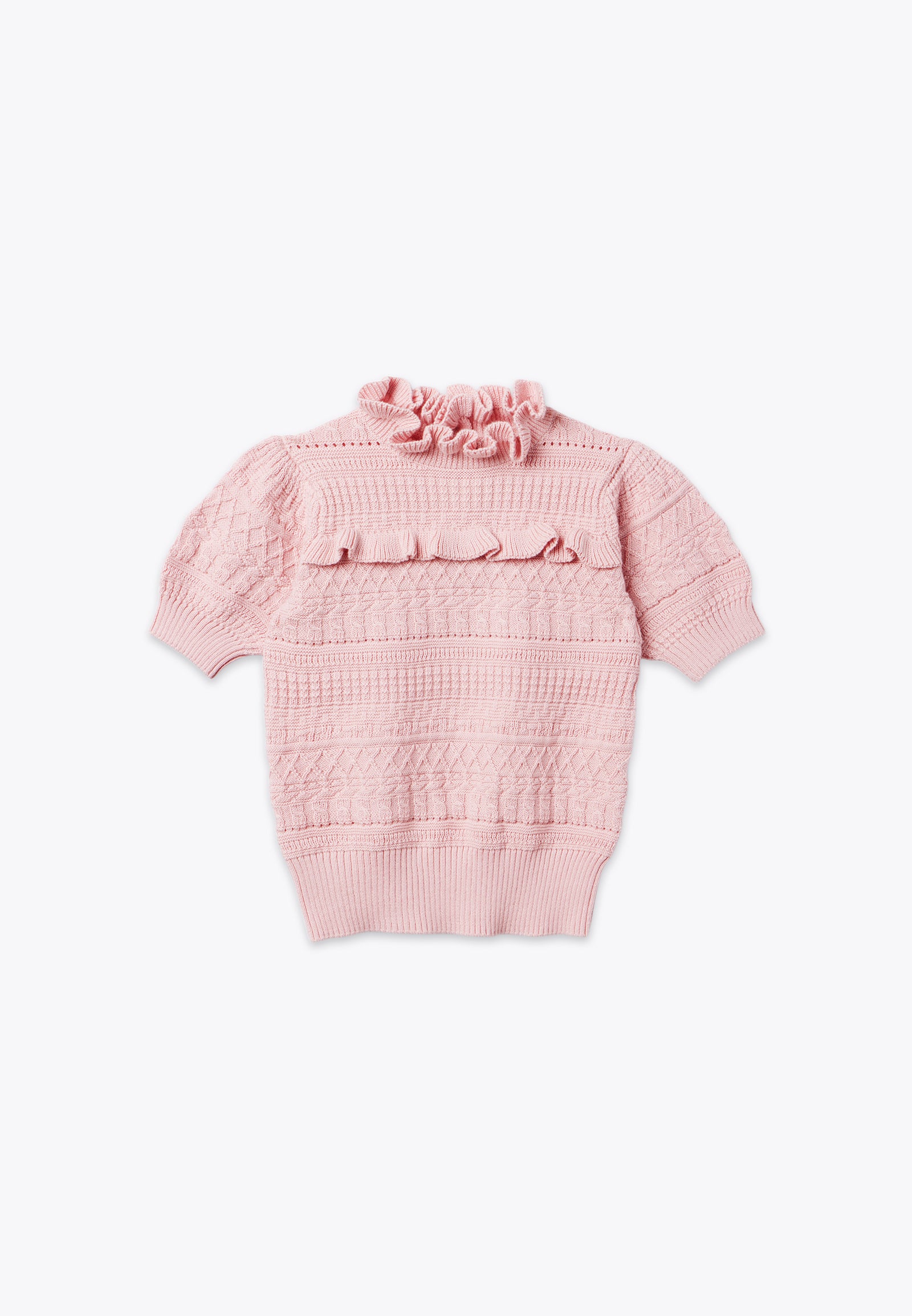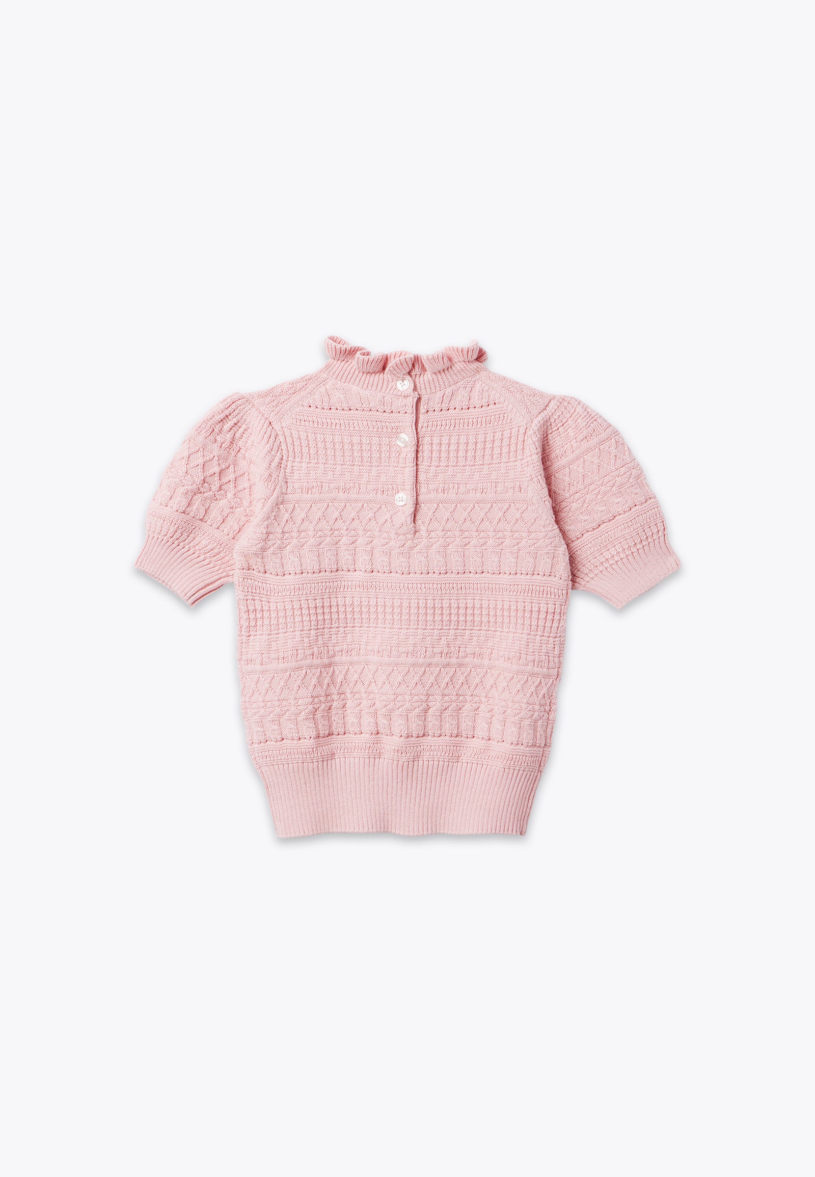 Top in maglia. Un capo d'abbigliamento perfetto da abbinare ai look preferiti della tua bambina: dalla trama sorprendente e dai simpatici volant, oltre che per le maniche a sbuffo, questo maglioncino valorizza istantaneamente qualsiasi outfit. Disponibile in avorio, verde acqua, rosa e rosso.