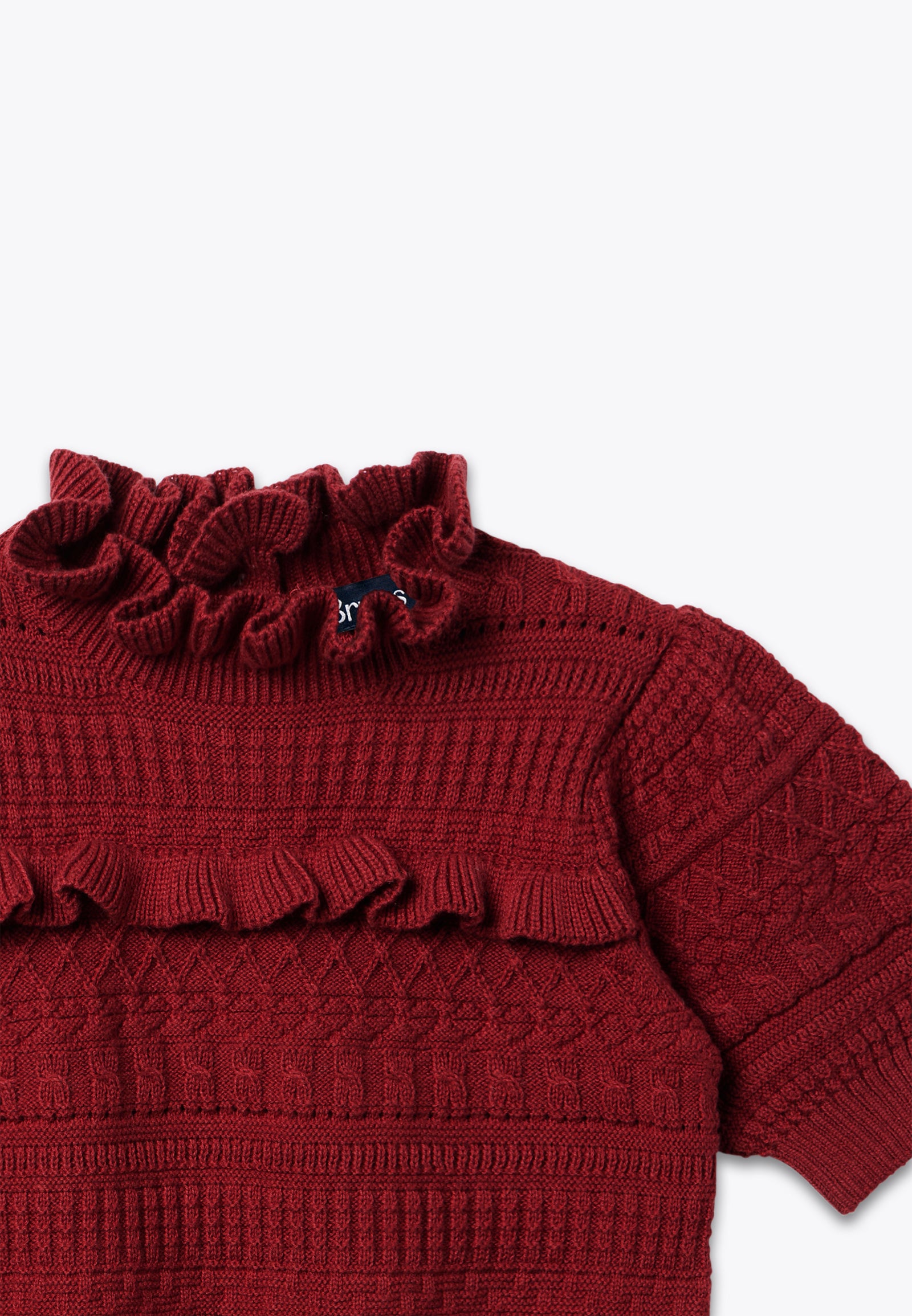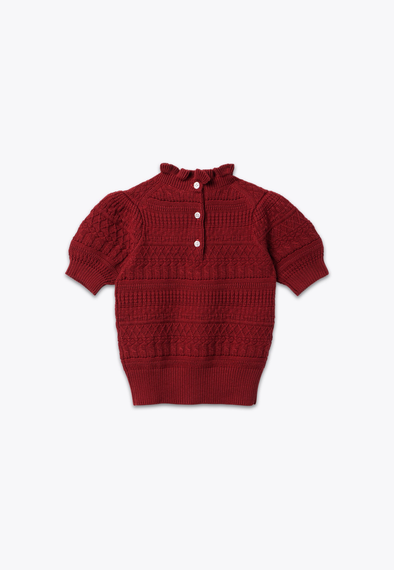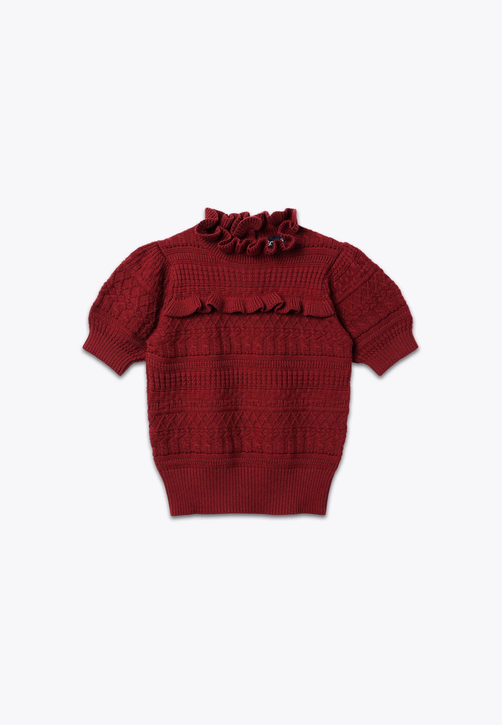 Top in maglia. Un capo d'abbigliamento perfetto da abbinare ai look preferiti della tua bambina: dalla trama sorprendente e dai simpatici volant, oltre che per le maniche a sbuffo, questo maglioncino valorizza istantaneamente qualsiasi outfit. Disponibile in avorio, verde acqua, rosa e rosso.