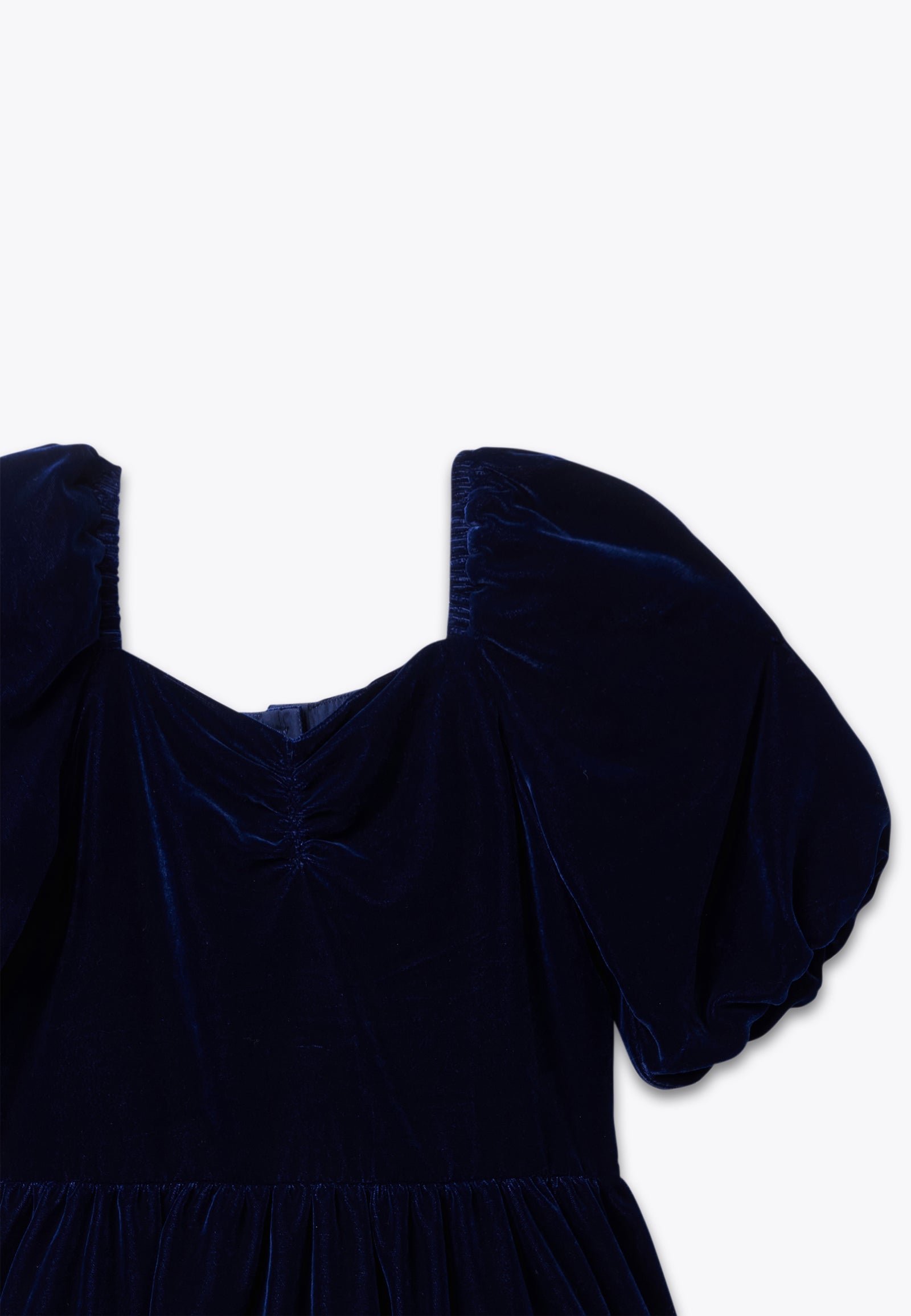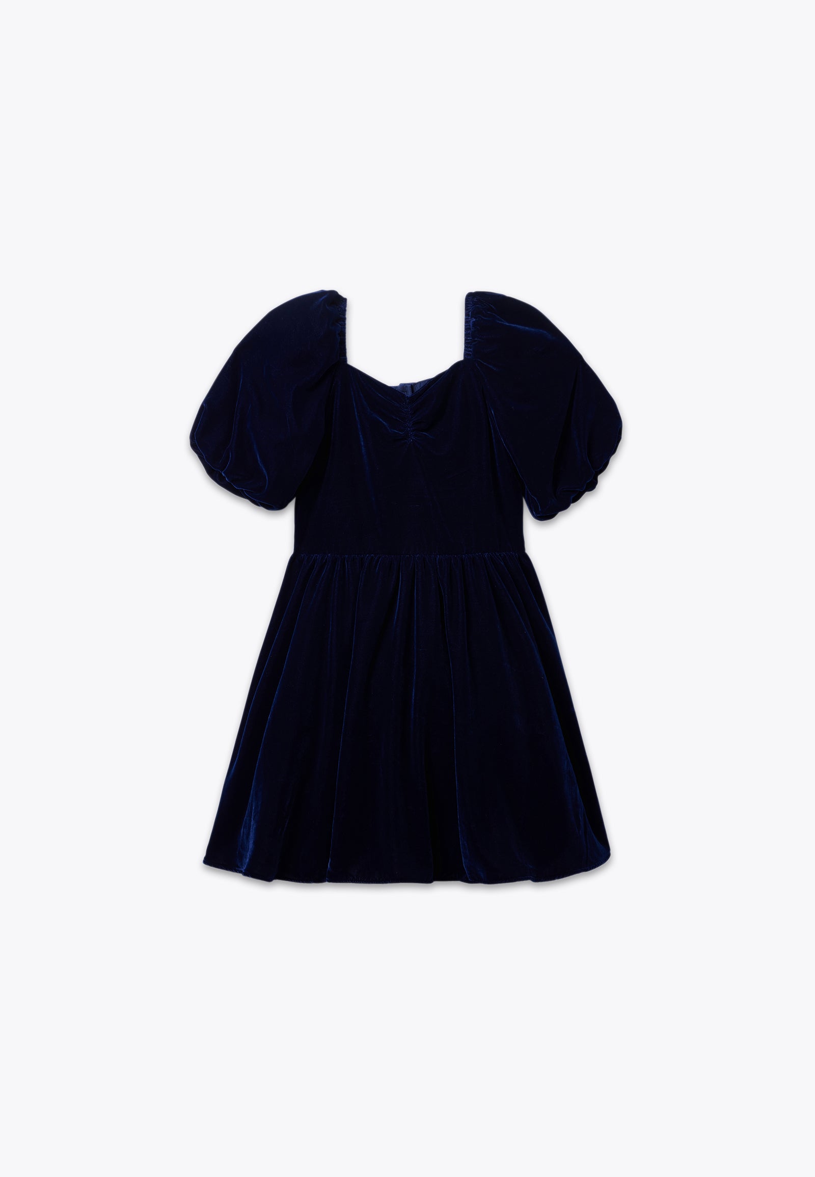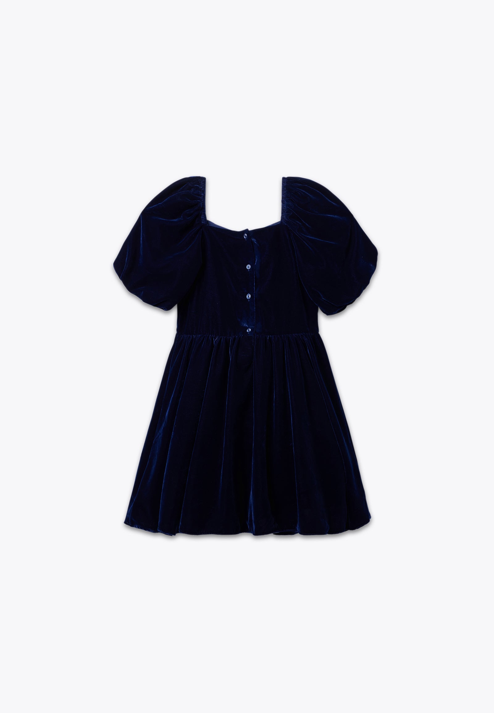 Abito effetto velluto. Un vestito perfetto per essere indossato durante gli eventi importanti delle vacanze natalizie, così come per una cerimonia o un'occasione speciale. Il morbido velluto dell'abitino e il dettaglio delle maniche a sbuffo doneranno alla tua bambina un tocco di classe unico. Disponibile in blu notte e in rosso.