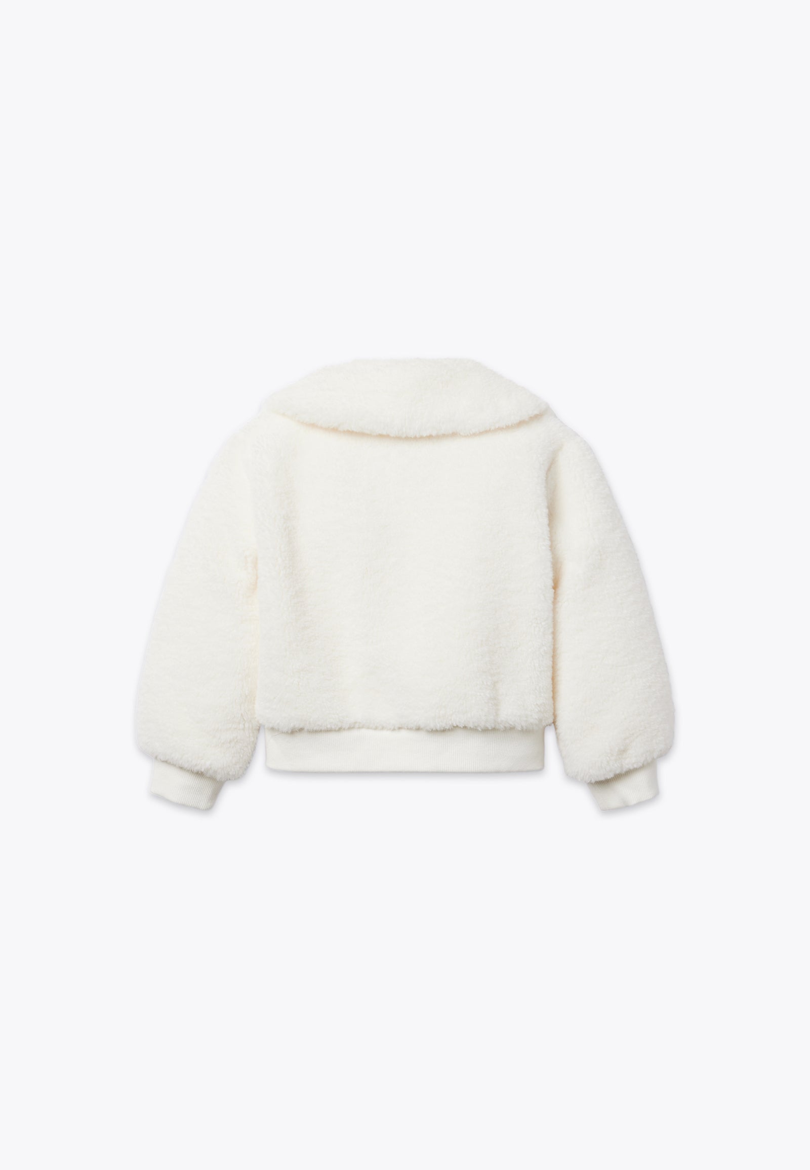 Bomber di pelliccia sintentica. Un capospalla unico per accompagnare la tua bambina durante le occasioni importanti, come cerimonie ed eventi. Abbina questo cappotto peloso a un abito o a un qualsiasi outfit grazie al colore classico e alla silhouette che non passa mai di moda. Disponibile in bianco.