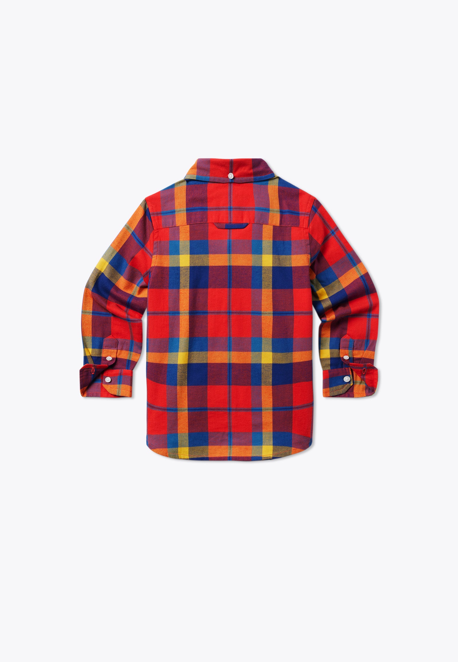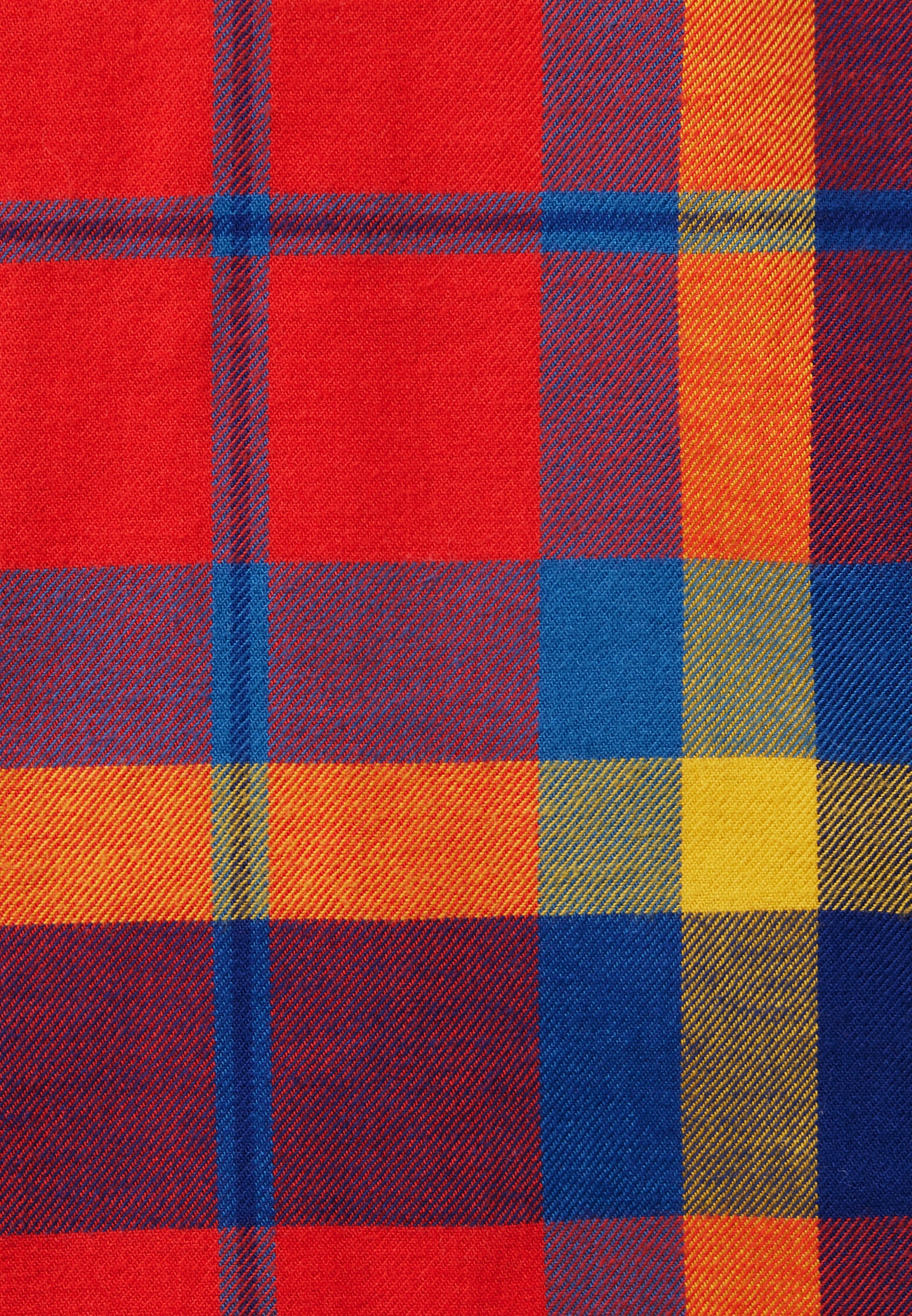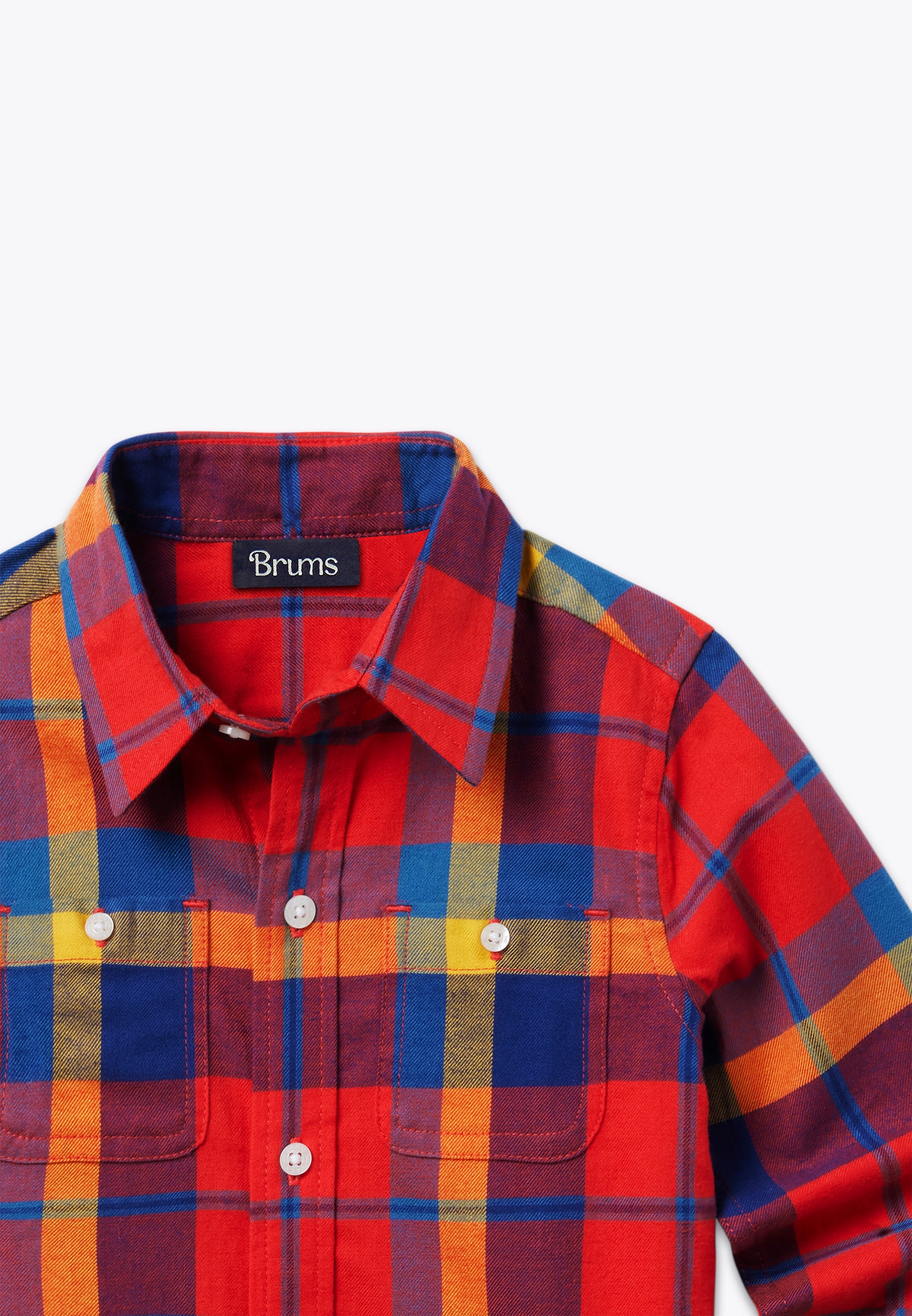 Camicia garzata in twill. Una versione in puro cotone della classica camicia a quadri perfetta da indossare con un jeans o un pantalone elegante, soprattutto durtante le feste grazie al colore unico. Disponibile in rosso con motivo a quadri blu e giallo.
