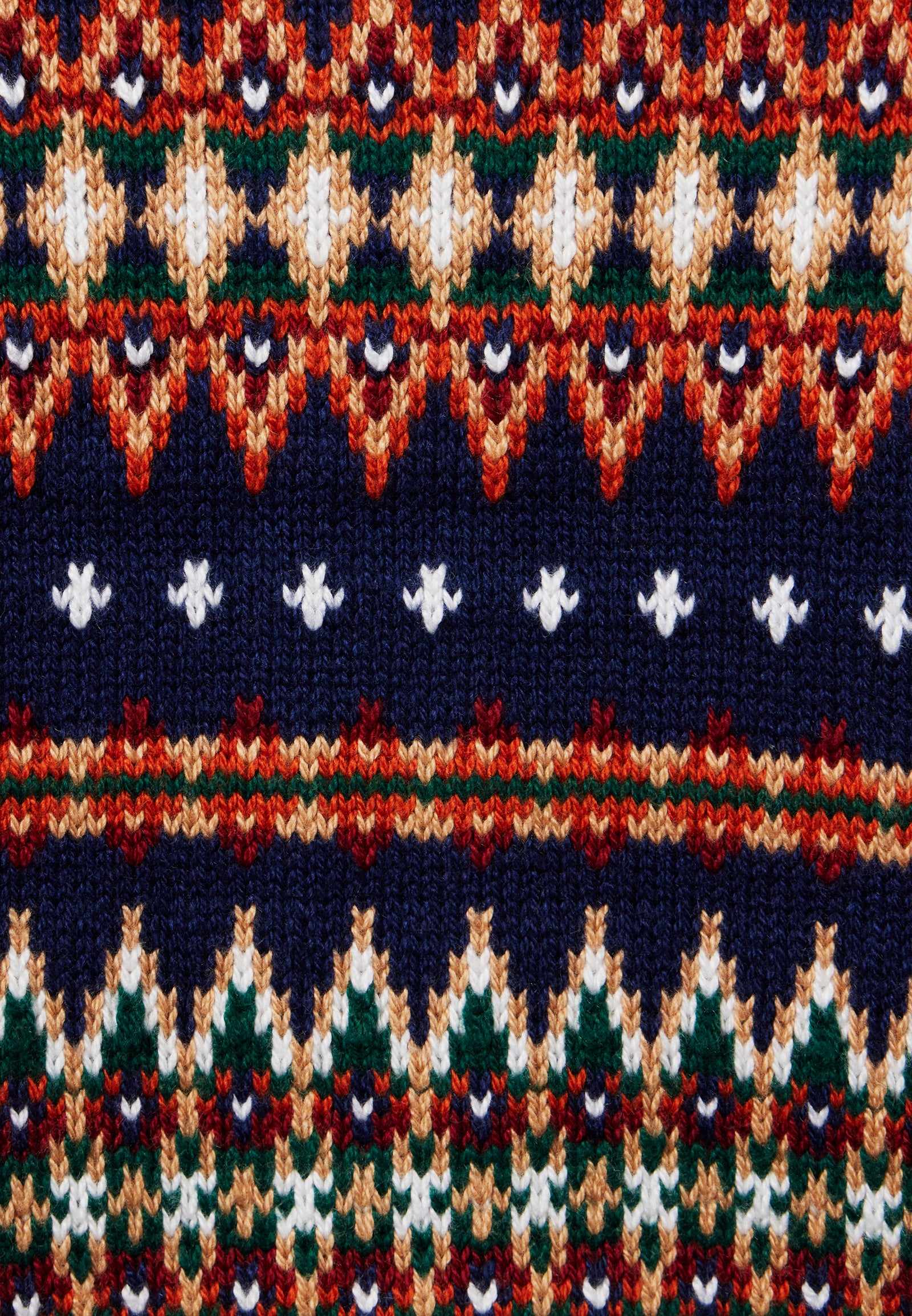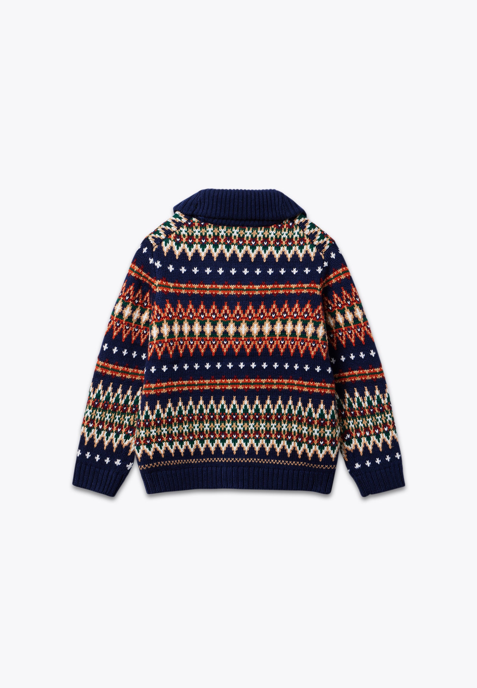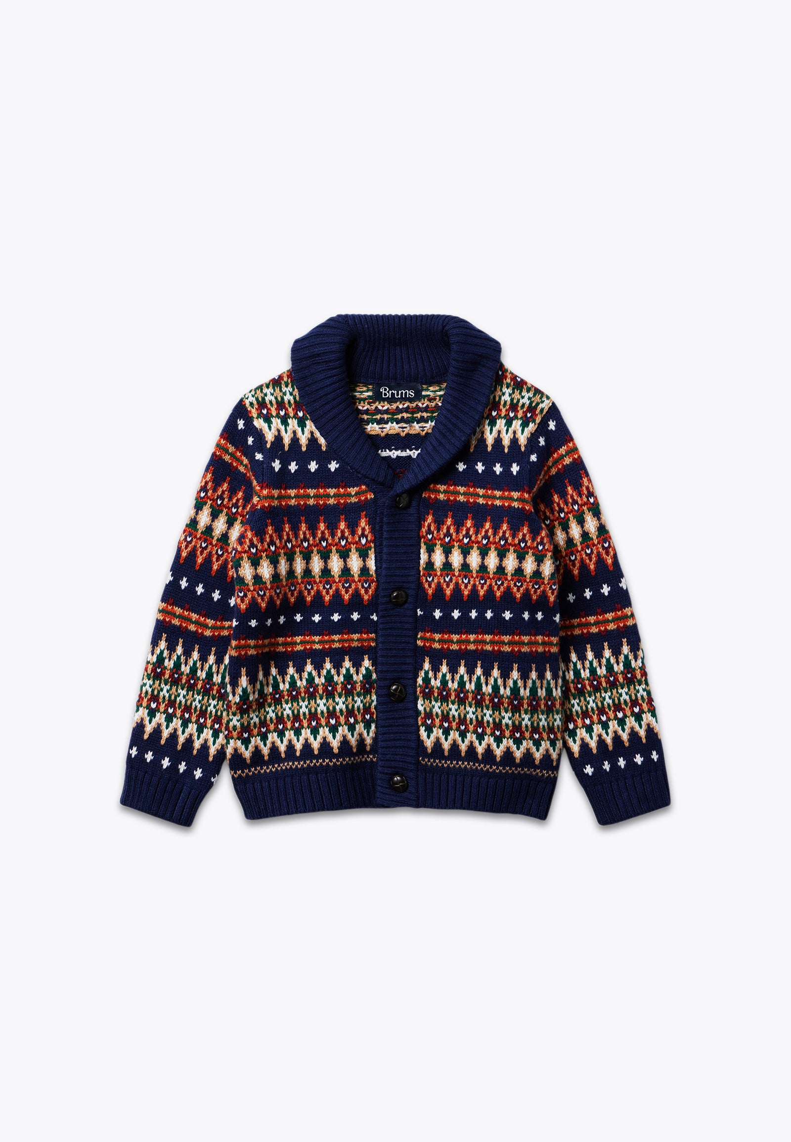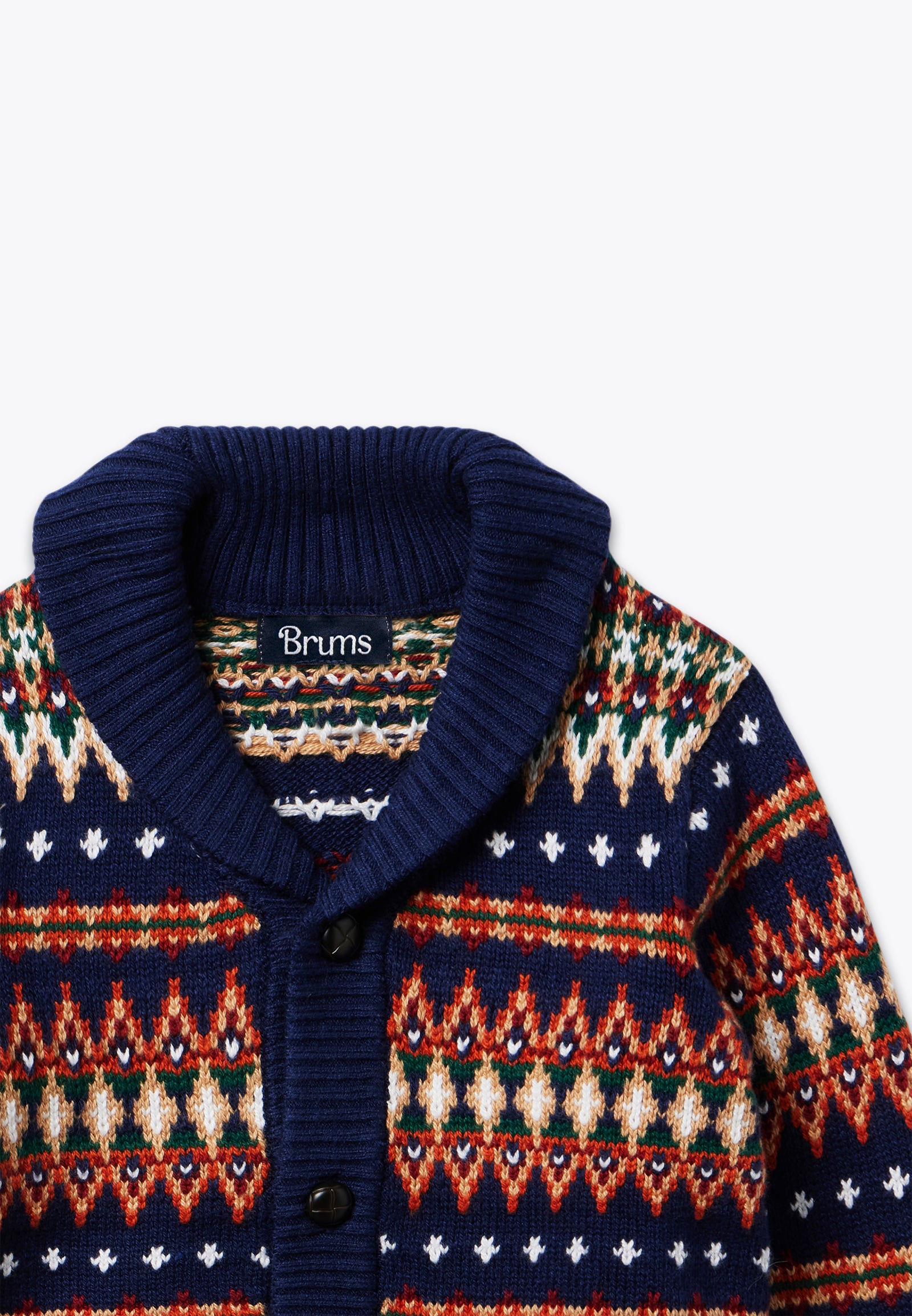 Cardigan fantasia. Classico ed elegante, questo top dalla finiture a coste è impreziosito da particolari bottoni in ecopelle e una fantasia colorata, che lo rendono perfetto per le passeggiate in città, così come per le occasioni speciali. Disponibile in blu notte con motivo fantasia multicolor.