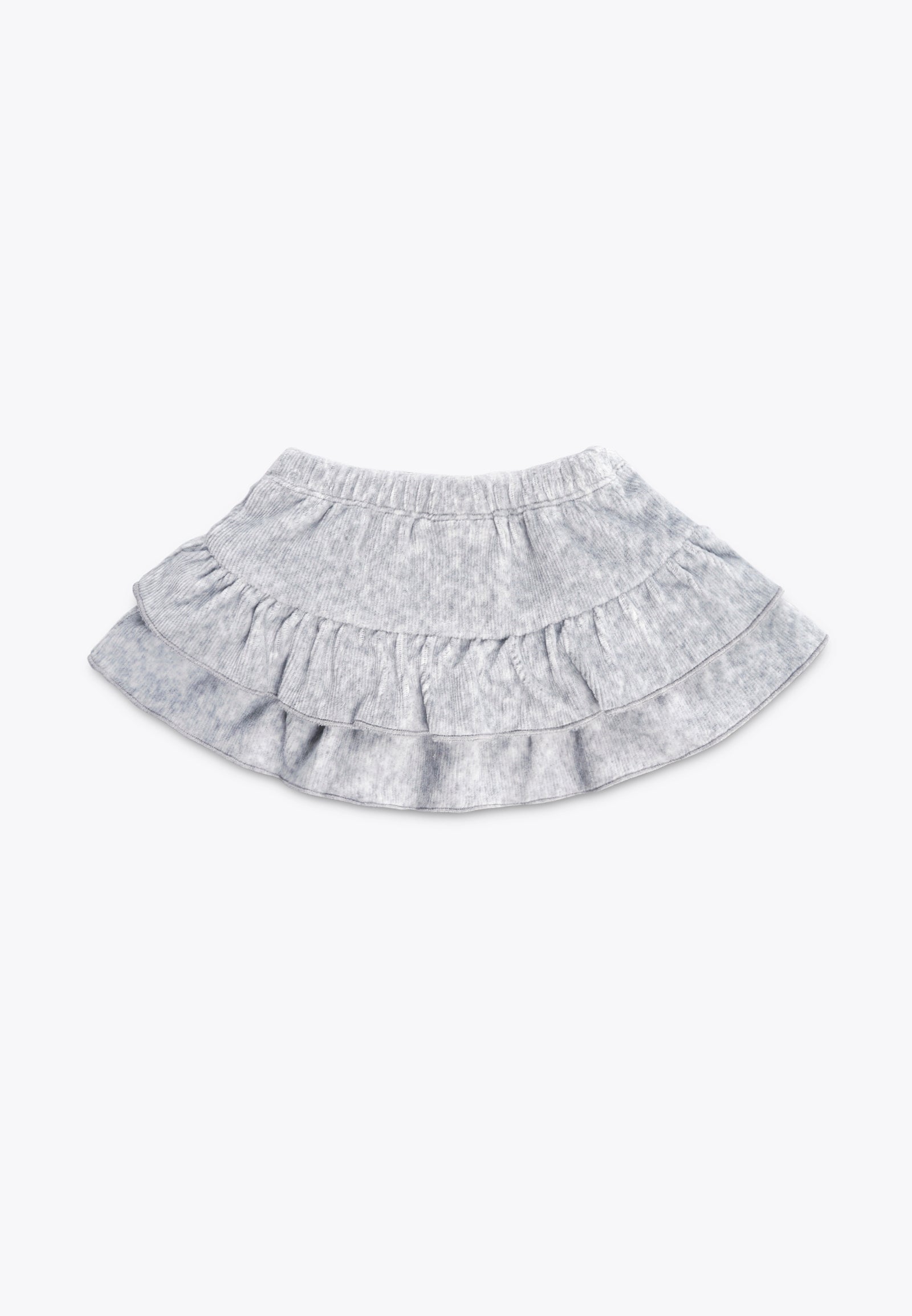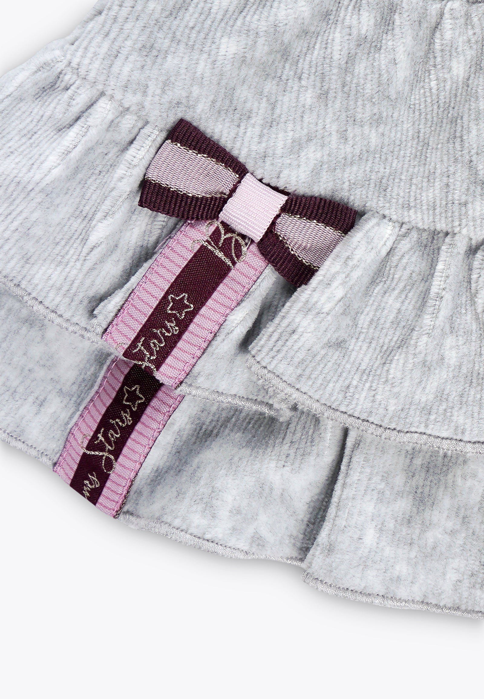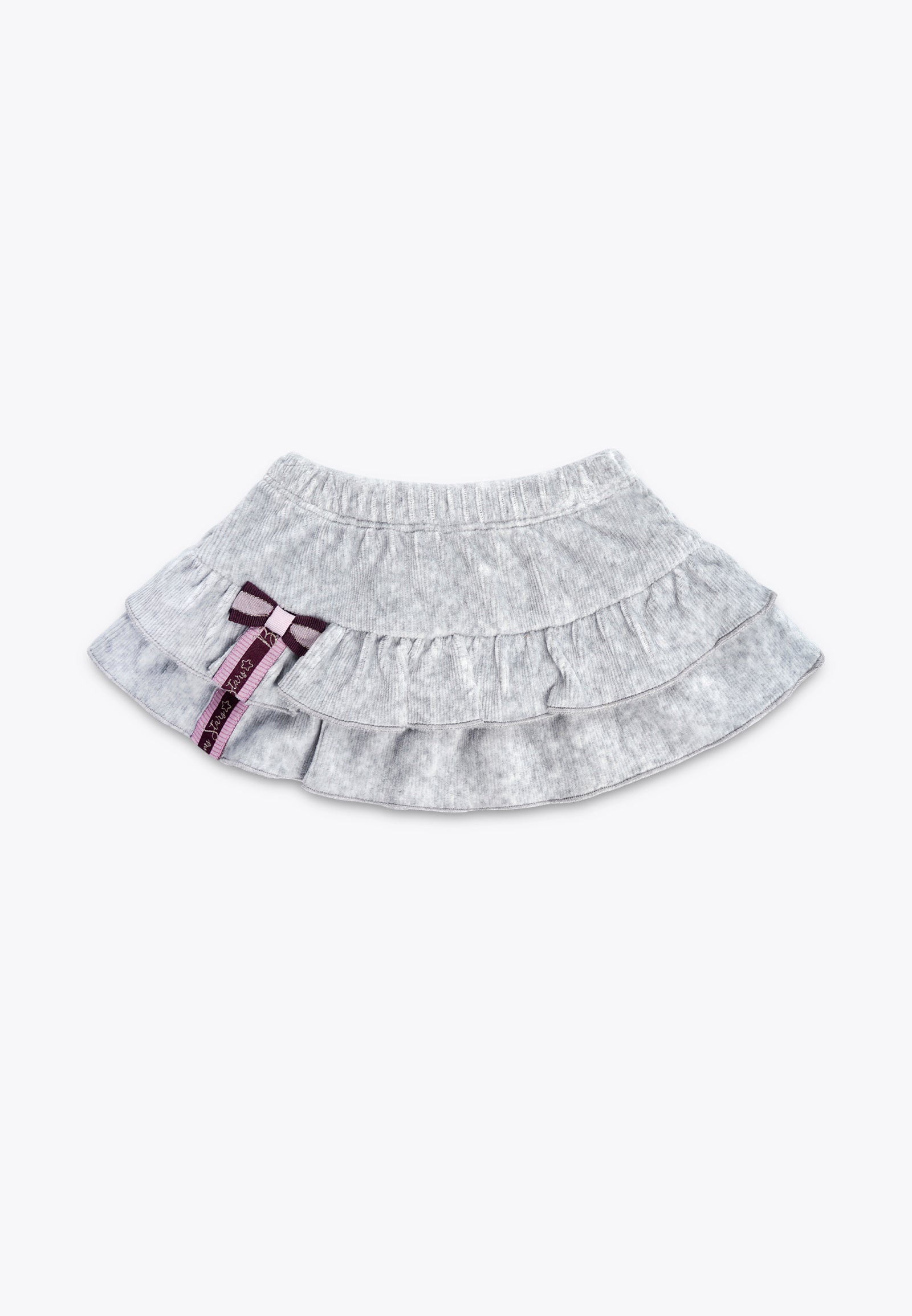 Gonna elasticizzata in ciniglia a coste. Una gonnellina per neonata firmata Brums Milano elegante e confortevole con delle simpatiche balze e un fiocchino jacquard che potrà accompagnare la tua bambina in tutte le occasioni per cui è richiesto un pizzico di stile: per una cerimonia, una festa o un compleanno, questo capo d'abbigliamento non potrà mancare abbinato a una t-shirt o una camicina. Disponibile in grigio con fiocco melanzana e in crema con fiocco tono su tono.