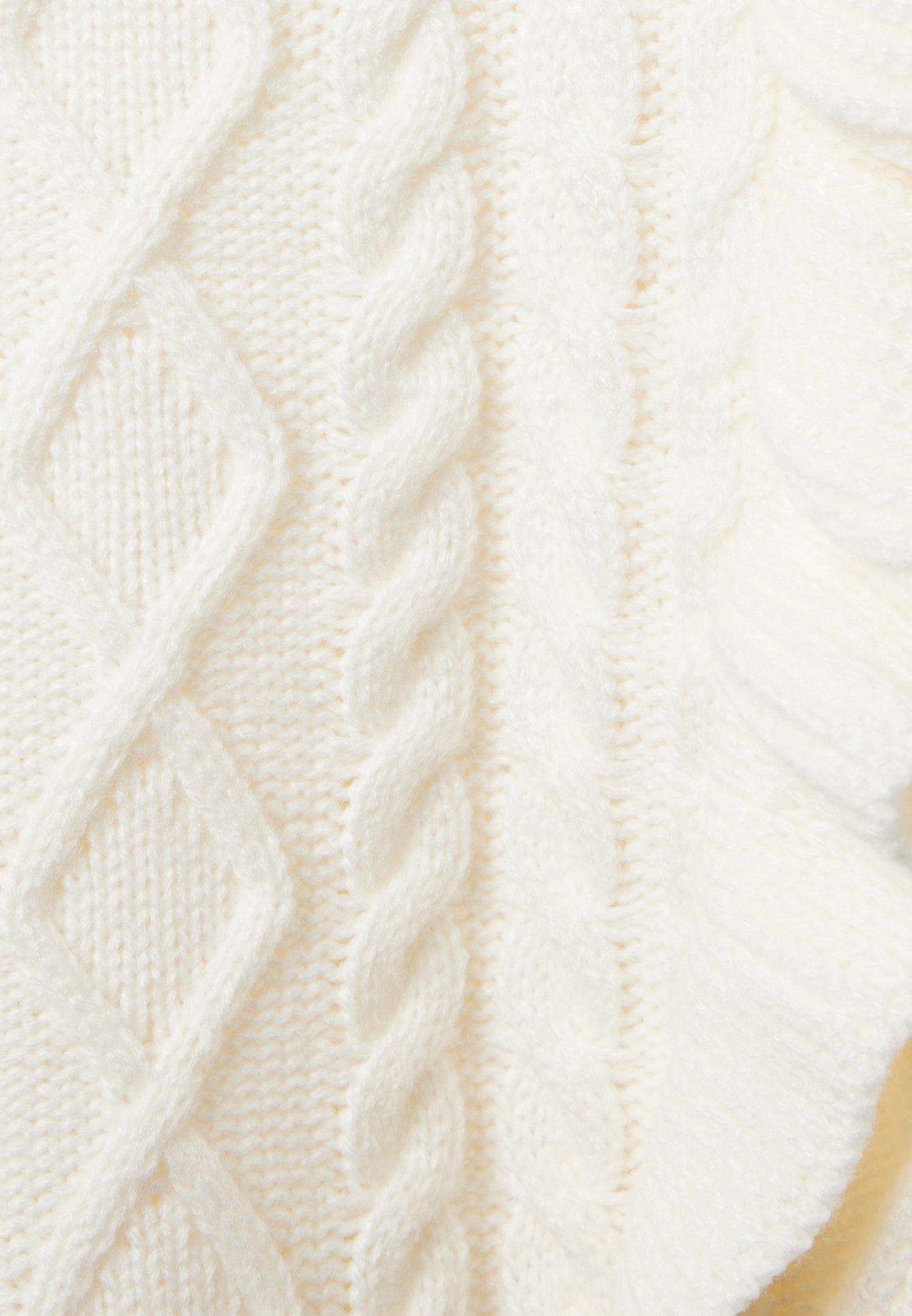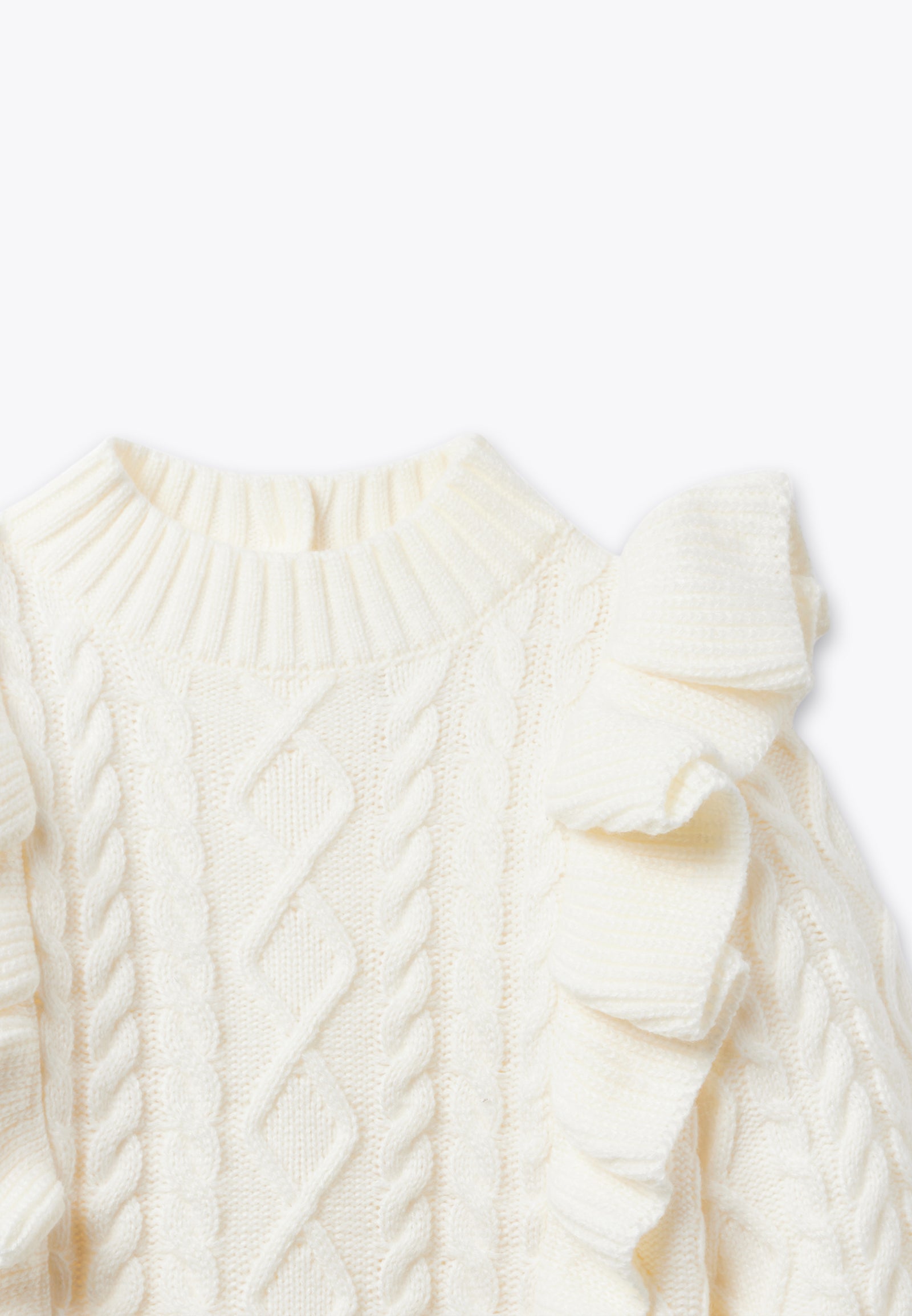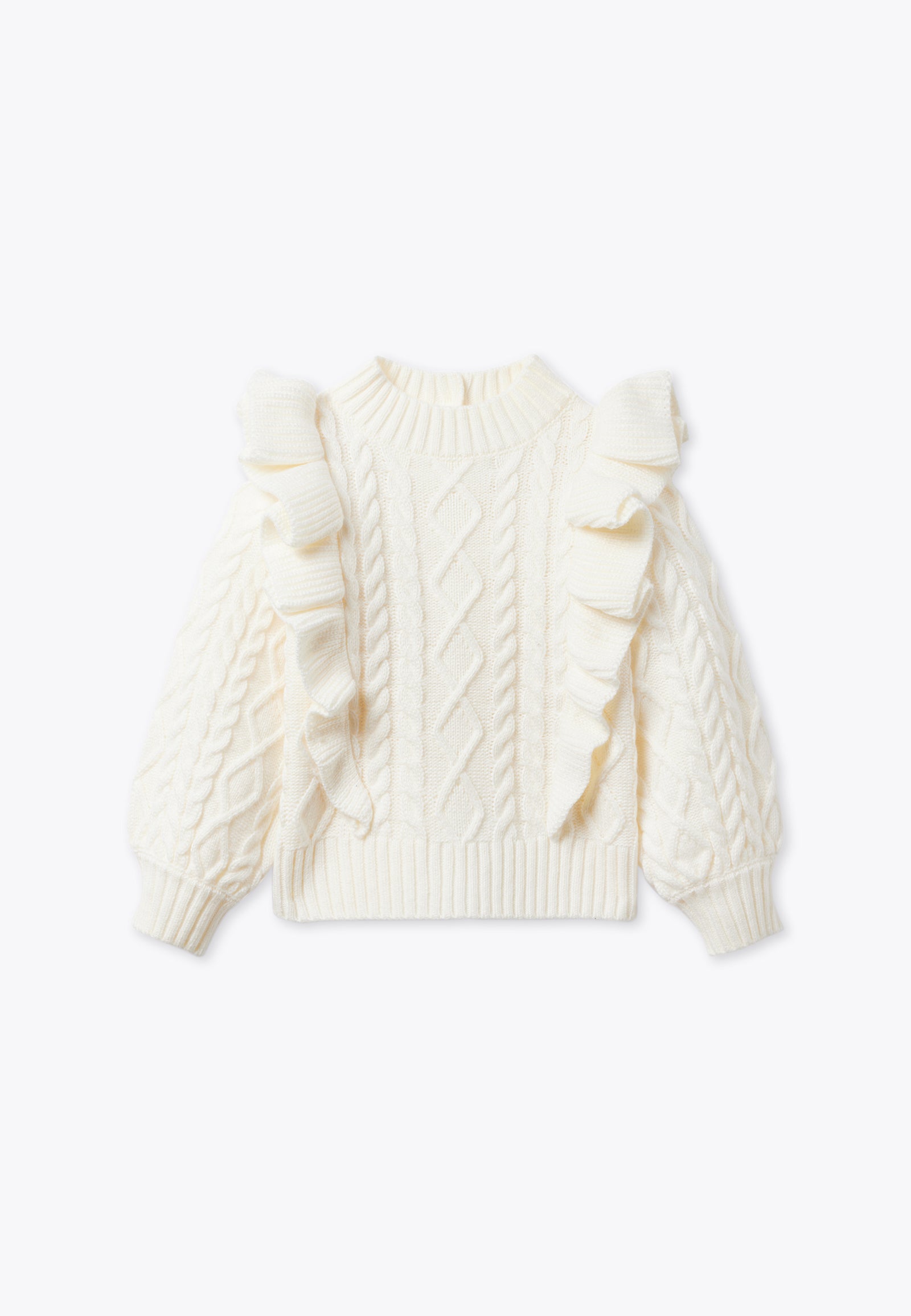 Maglione con motivo a trecce e volant. Un top a manica lunga perfetto per ogni occasione durante la stagione invernale: lavorato a trecce, con simpatiche maniche a sbuffo e volant sul davanti, non potrà mancare per un outfit senza eguali. Disponibile in bianco.