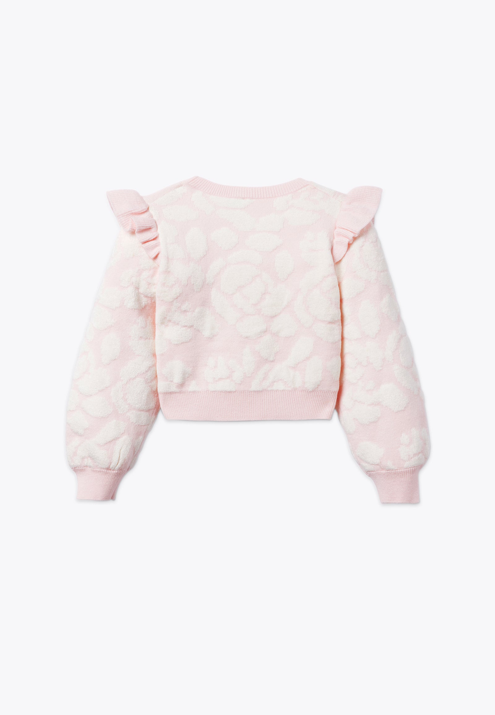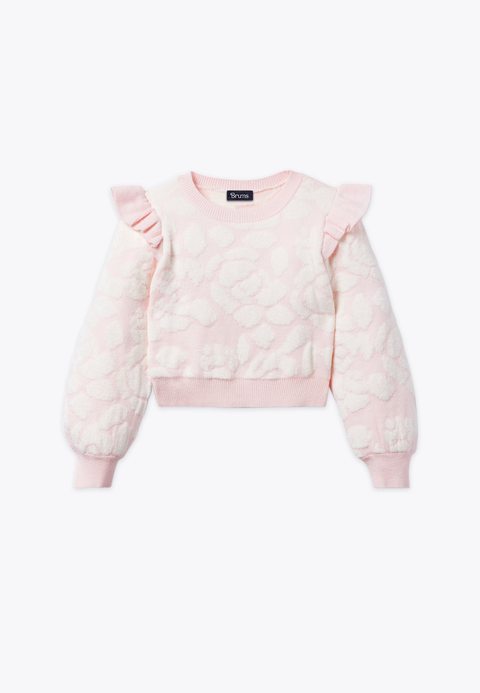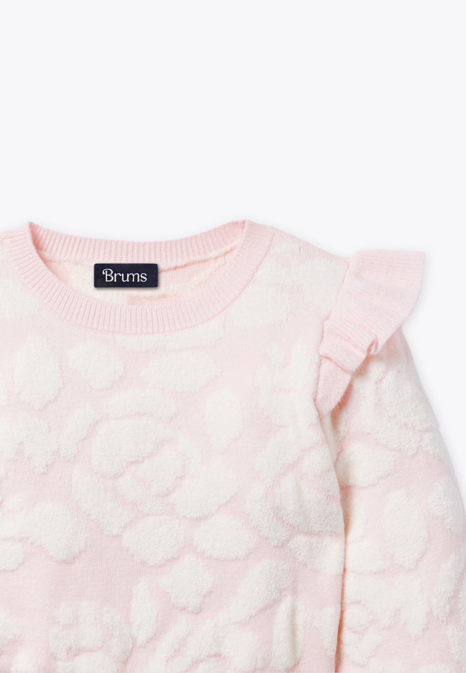 Maglione fantasia con voltant. Un capo d'abbigliamento reso speciale grazie al disegno floreale senza tempo: festoso, elegante, classico, questo maglioncino è perfetto per essere indossato durante le feste, le cerimonie e le grandi occasioni. Disponibile in rosa con fantasia a rose.