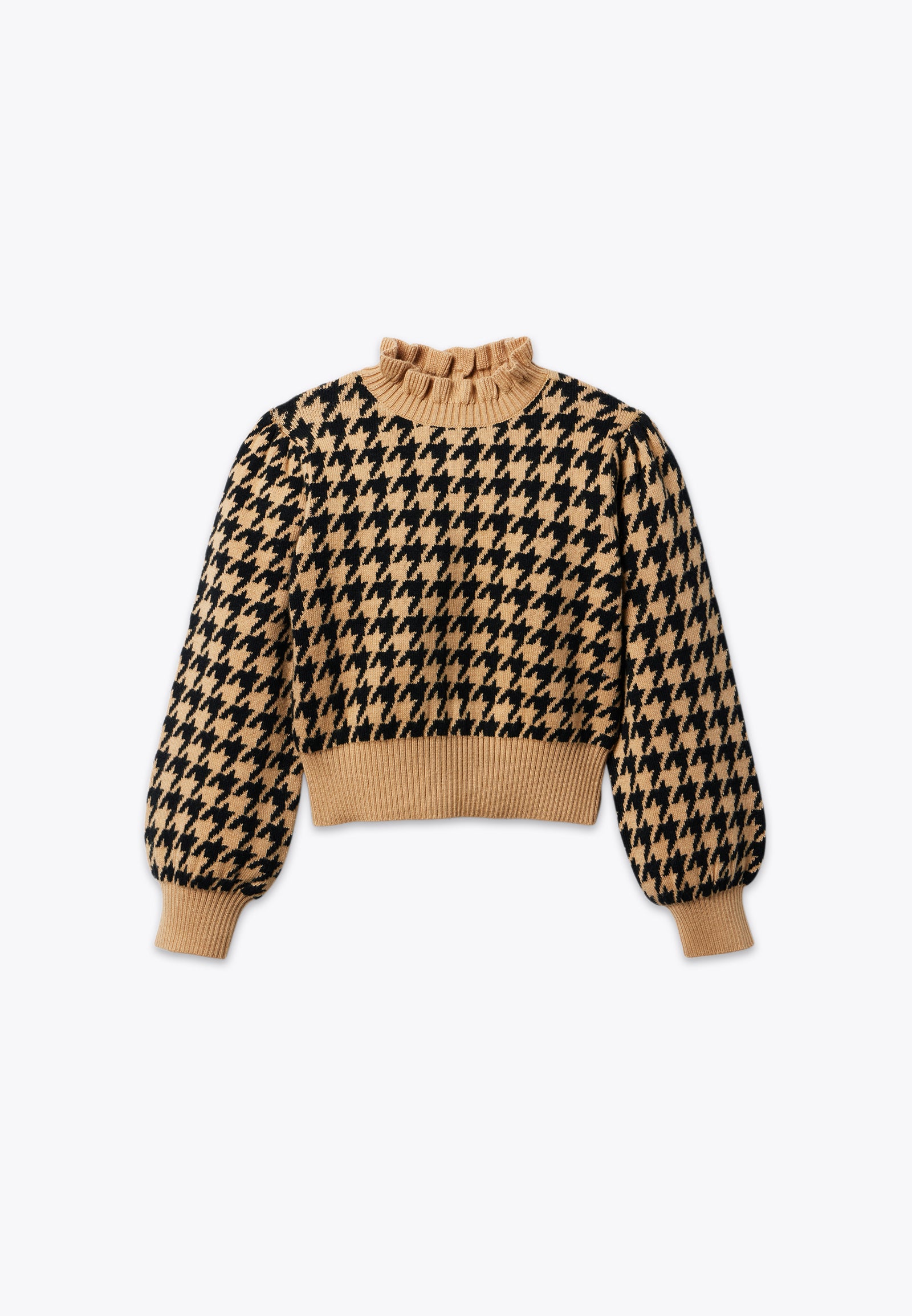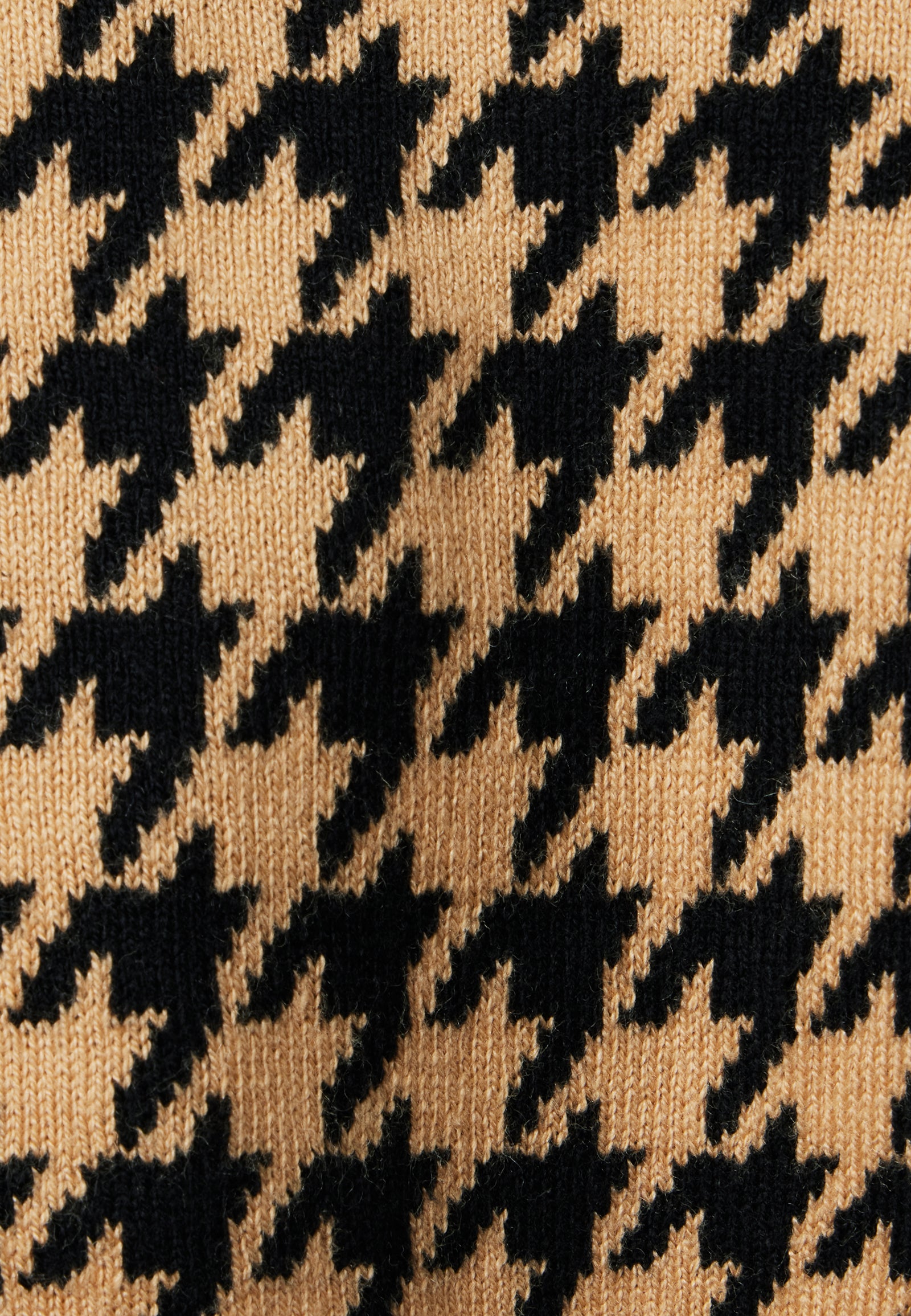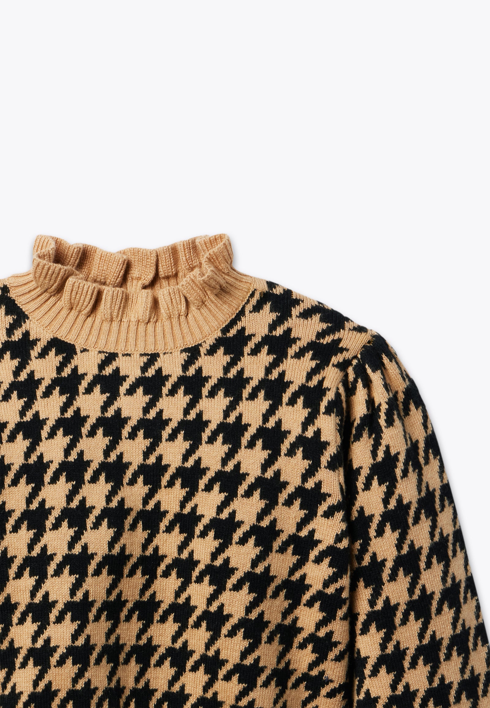 Maglione con fantasia a pied de poule. Un capo d'abbigliamento reso speciale grazie al disegno senza tempo del motivo a pied de poule: festoso, elegante, classico, questo top è perfetto per essere indossato durante le feste natalizie, le cerimonie e le grandi occasioni. Disponibile beige con fantasia a pied de poule.