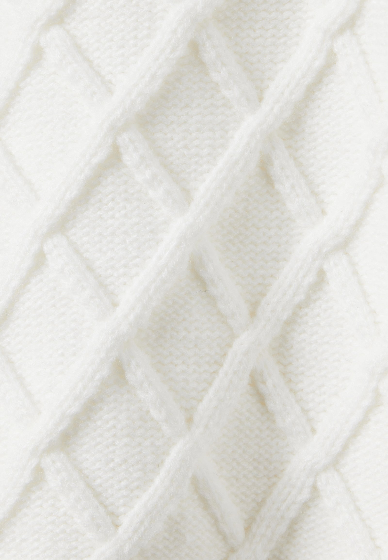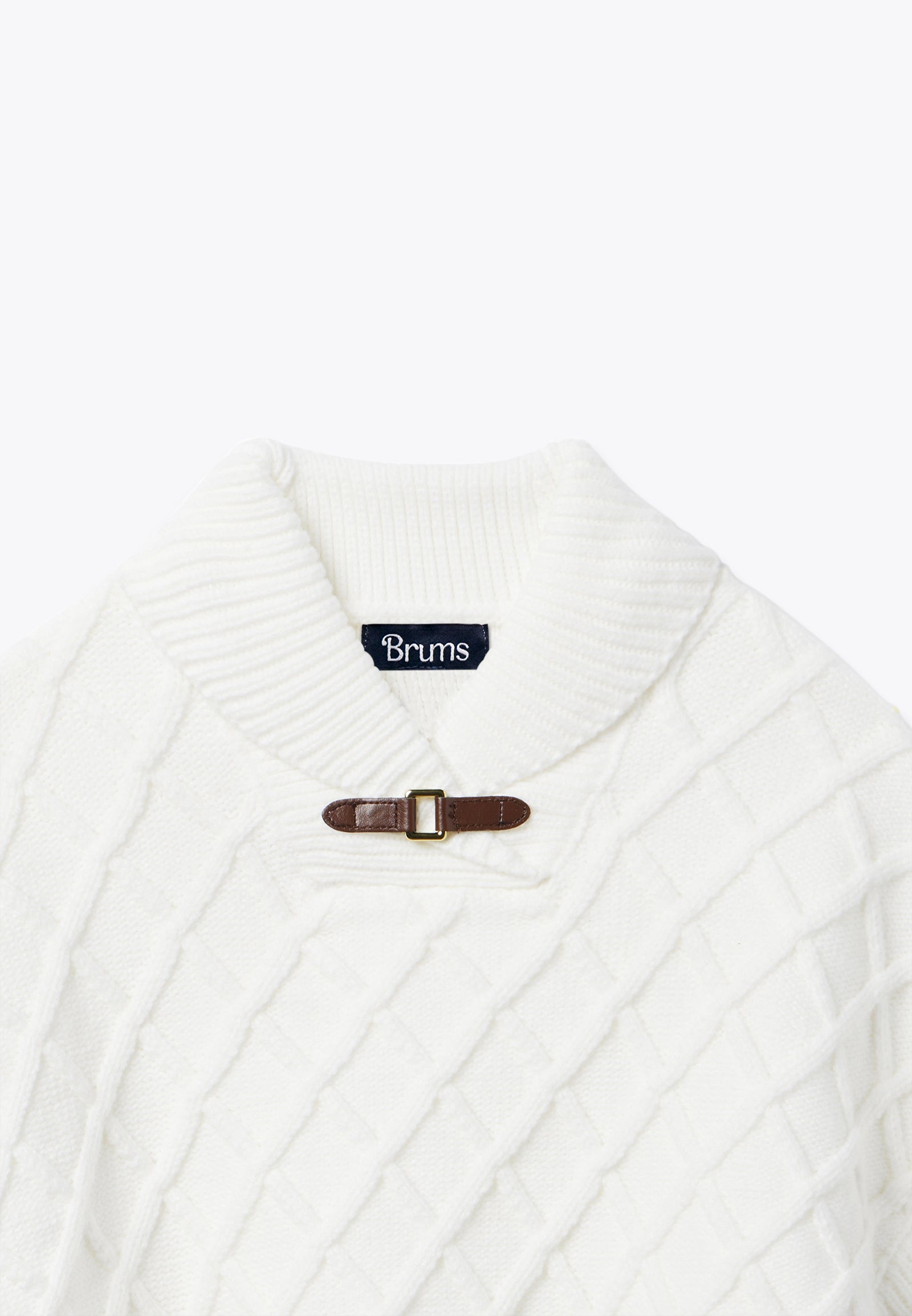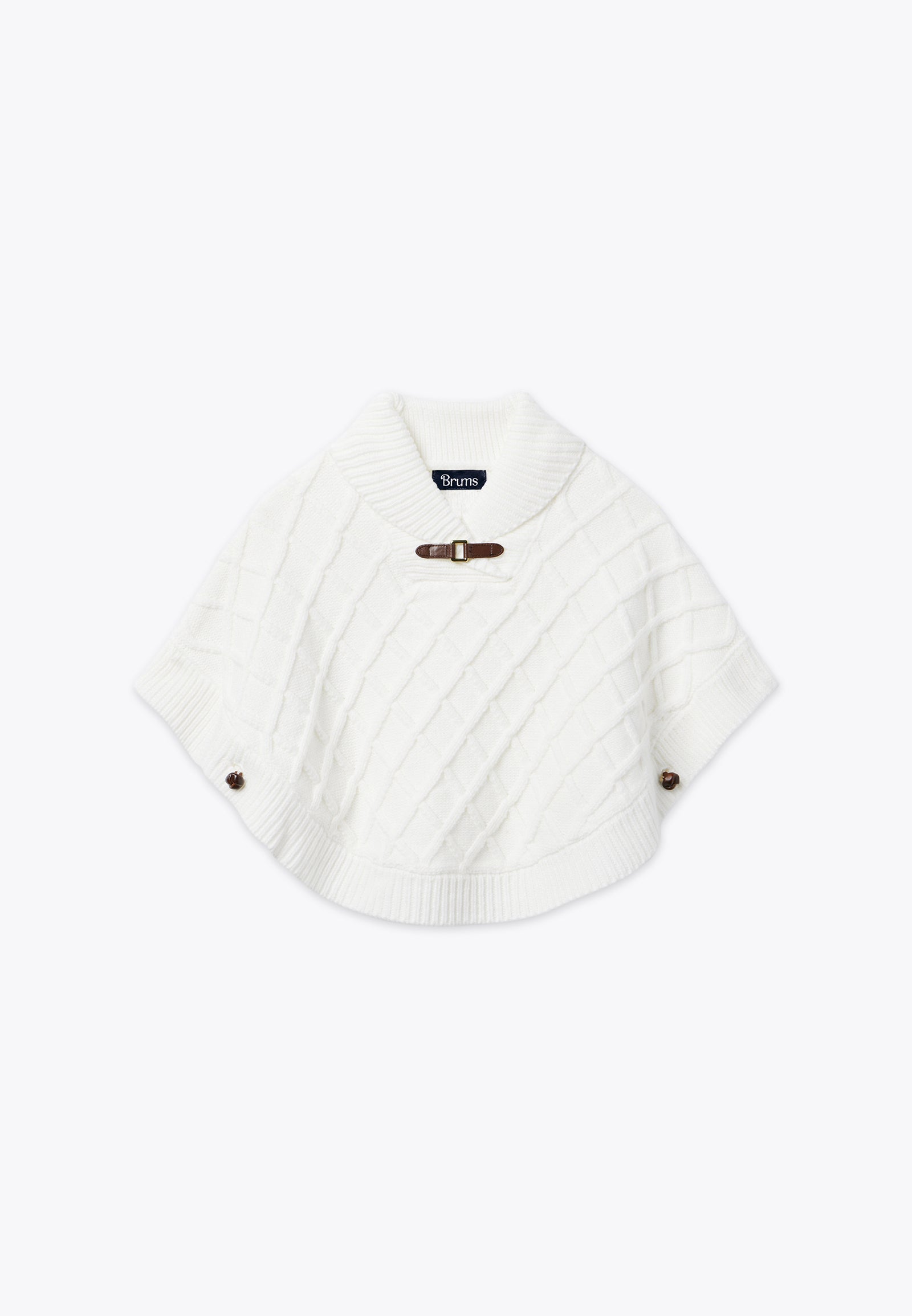 Mantella in maglia. Una mantella dal tessuto morbido che offre calore alla tua bambina, pronta per essere abbinata a qualsiasi look. Una trama a rombi, dettagli in costina e una simpatica fibbia in ecopelle ne adornano la fattura, donandole quel tocco chic dall'ispirazione equestre. Perfetta per passeggiare in città o per un'occasione speciale. Disponibile in avorio.