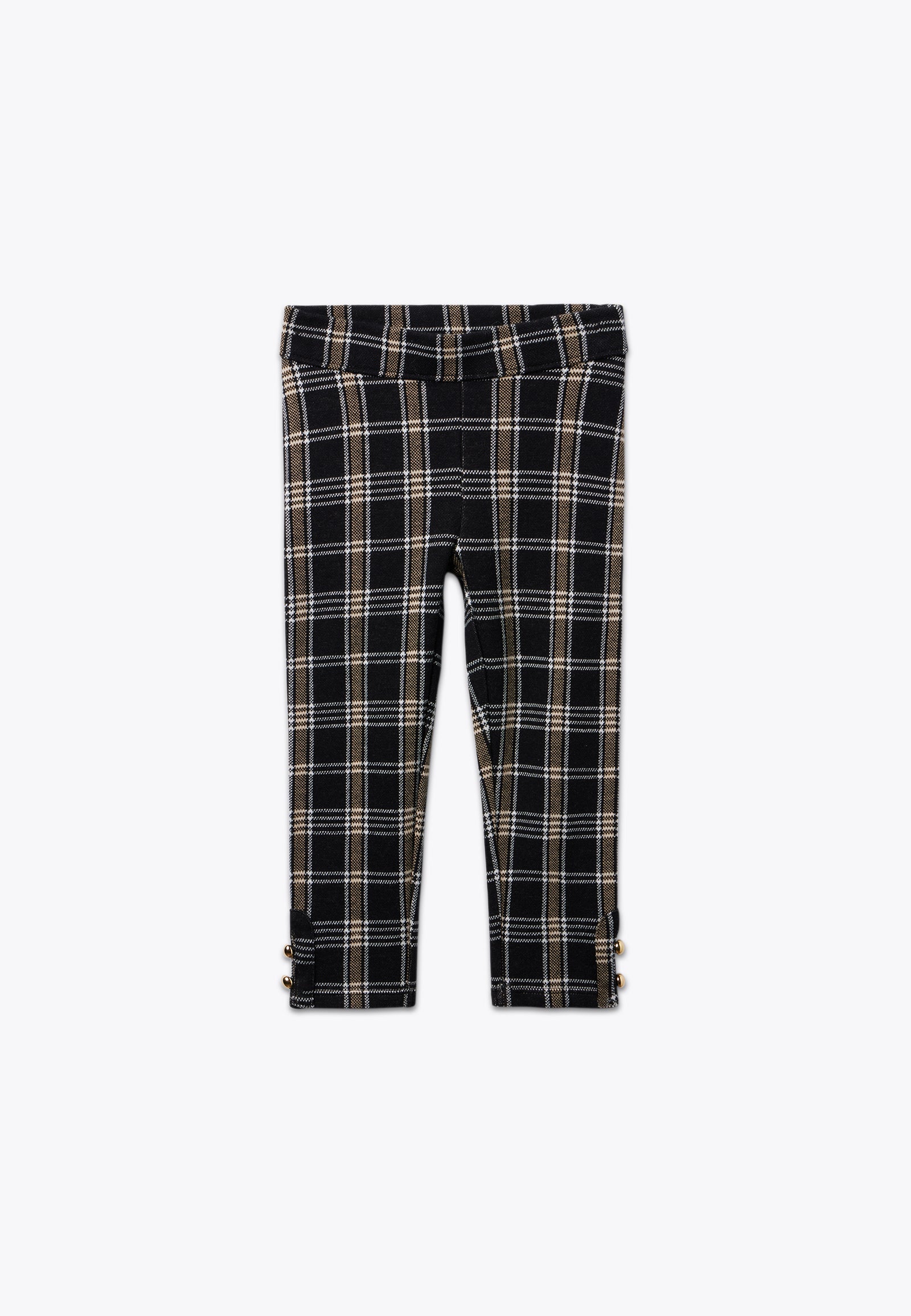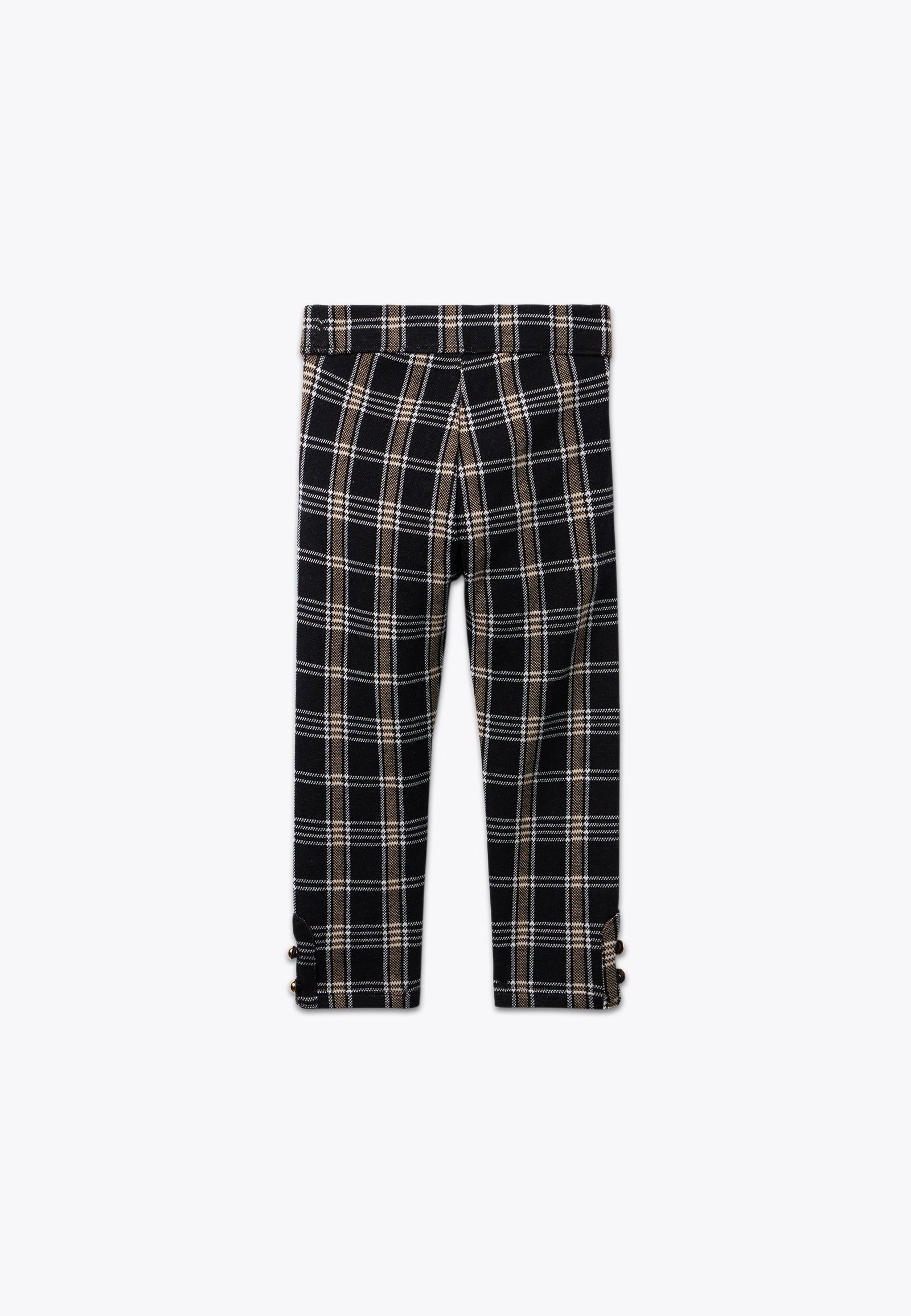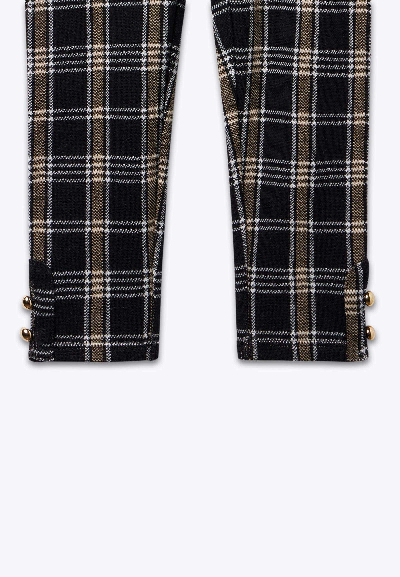 Pantalone elasticizzato. Un pantalone lungo dal motivo a quadri: versatile, comodo e perfetto da abbinare a una camicia così come a una t-shirt. Il dettaglio unico dei bottoni dorati li rende la scelta giusta anche per le occasioni più eleganti. Disponibile in nero con motivo scozzese.