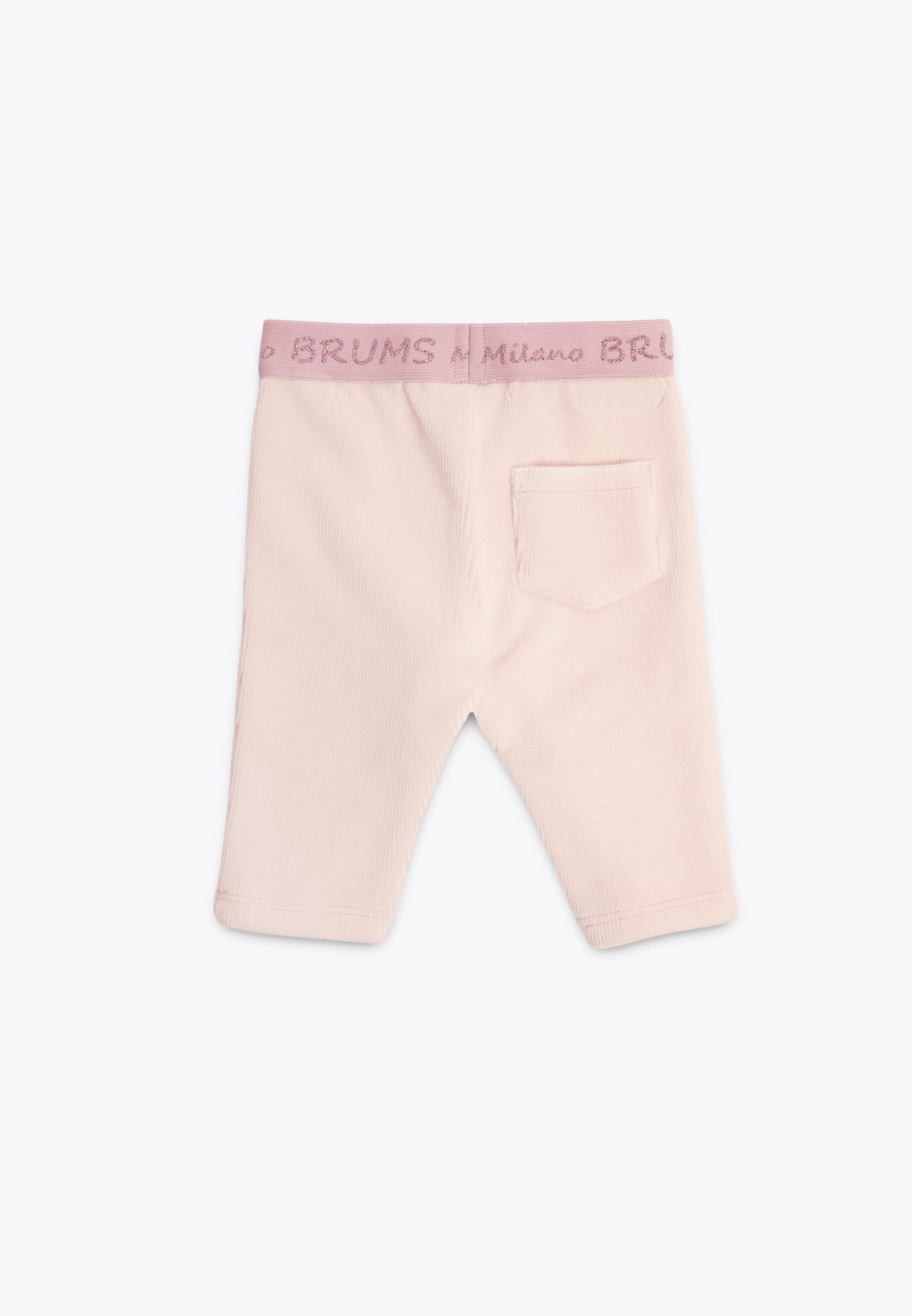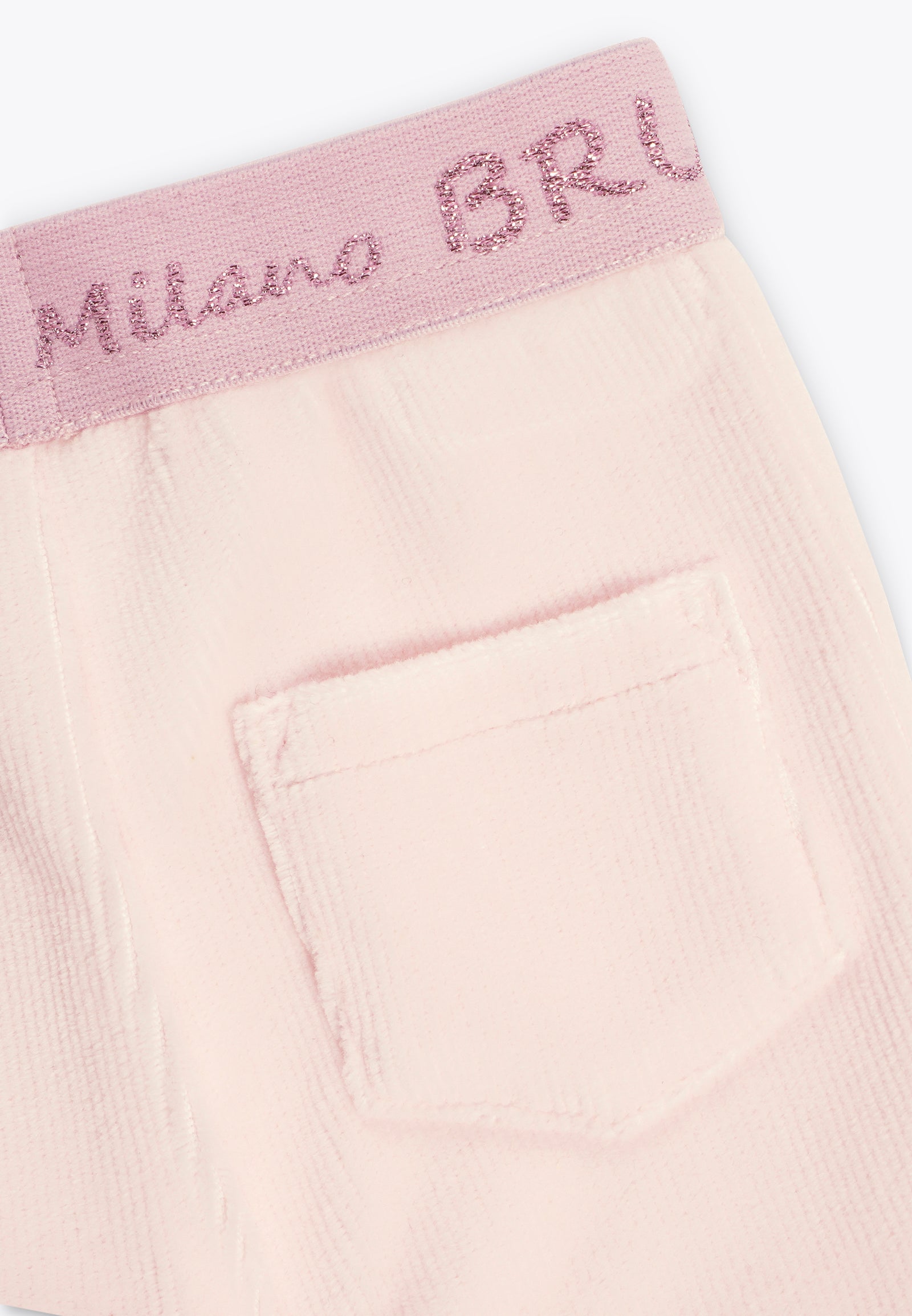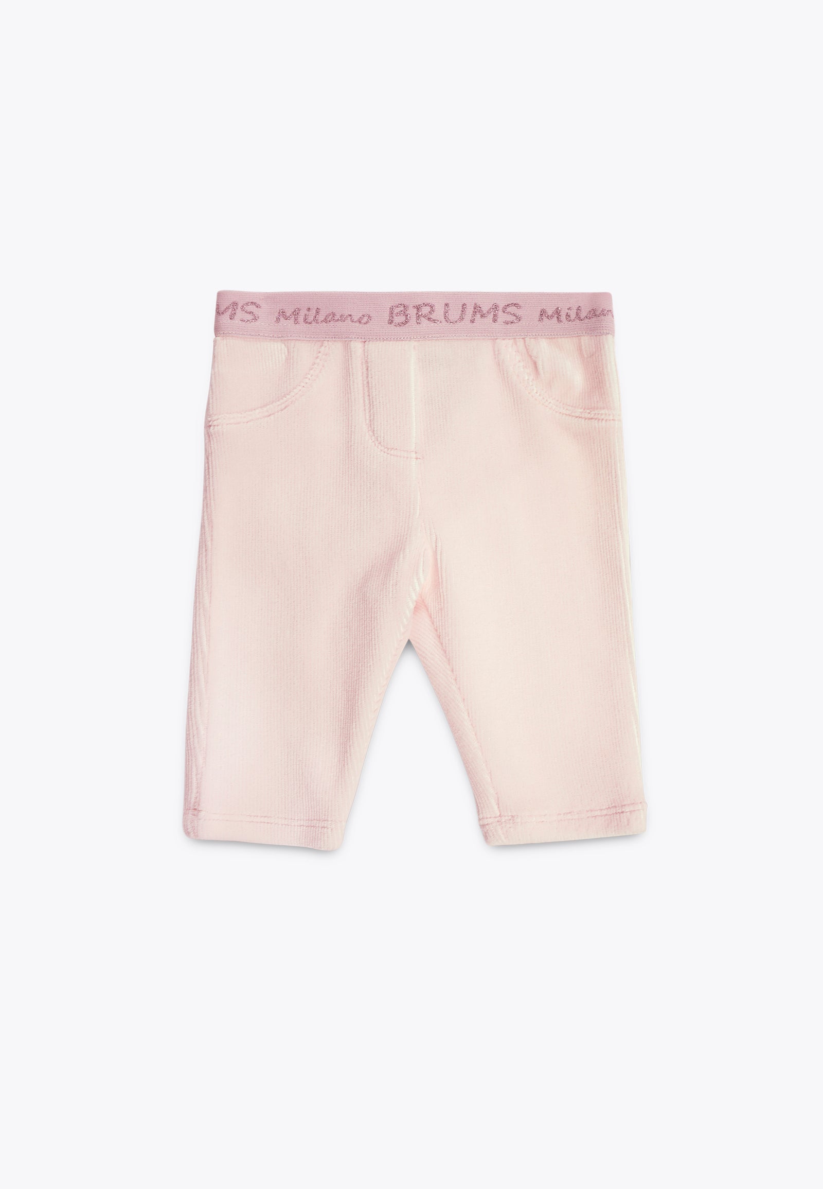Pantalone in ciniglia a coste. Un pantaloncino per neonata firmato Brums Milano elegante e confortevole: realizzato in ciniglia a coste - morbida al tatto - presenta un taschino applicato sul retro, una finta taschina e una patta sul davanti. L'elastico in vita jacquard con la scritta Brums Milano decorata con brillantini offre una vestibilità comoda e regolabile. Questo pantalone è perfetto per creare look alla moda per neonata, garantendo comfort grazie alla sua morbidezza. Disponibile in rosa, rosso e grigio.