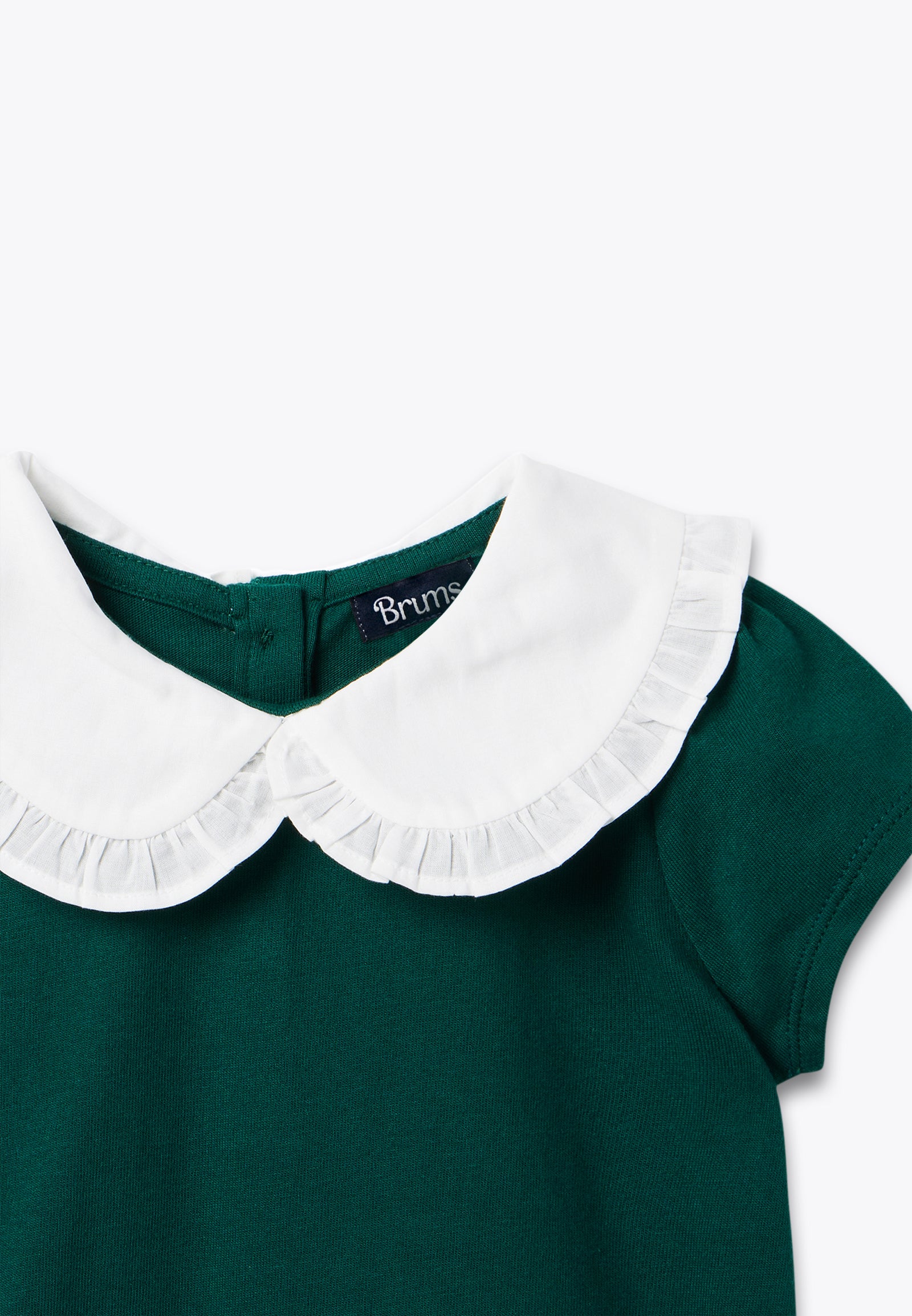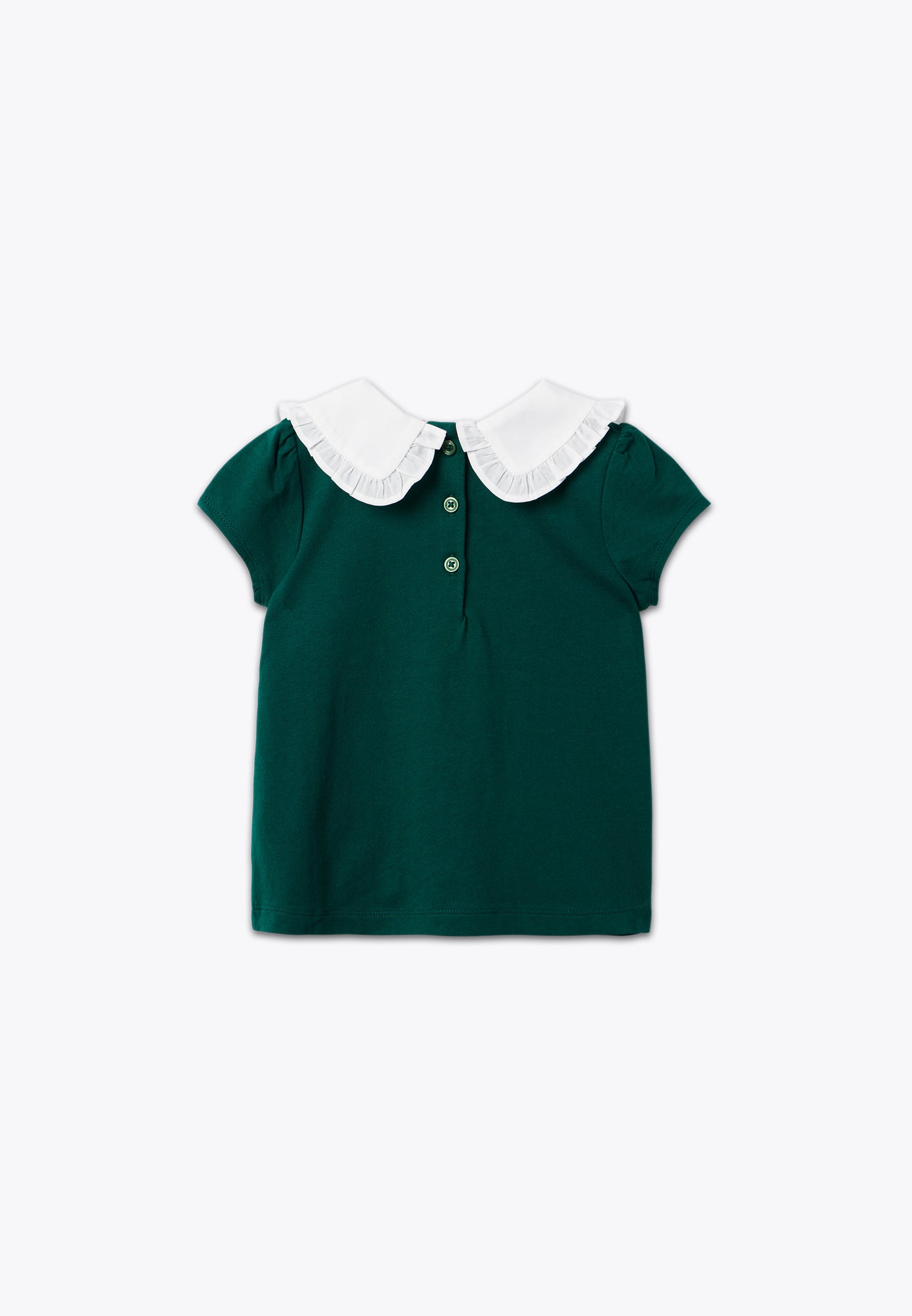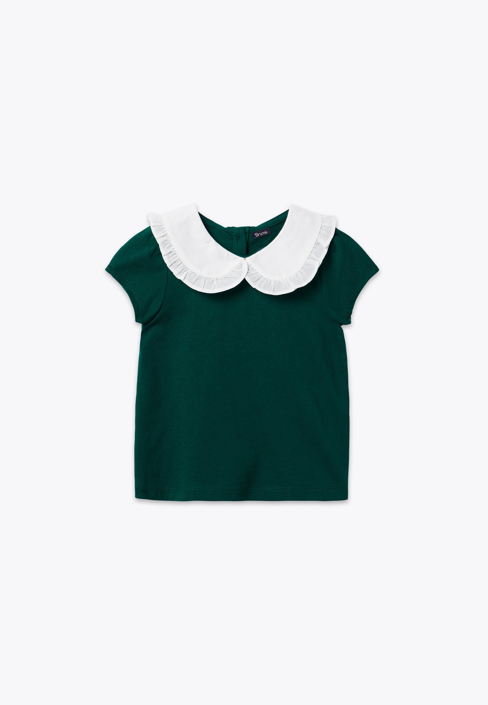 Top in jersey. Un capo d'abbigliamento in morbido jersey di puro cotone, dal colletto alla Peter Pan impreziosito da un delicato volant adatto per le grandi occasioni come le feste. Disponibile in rosso e in verde scuro.
