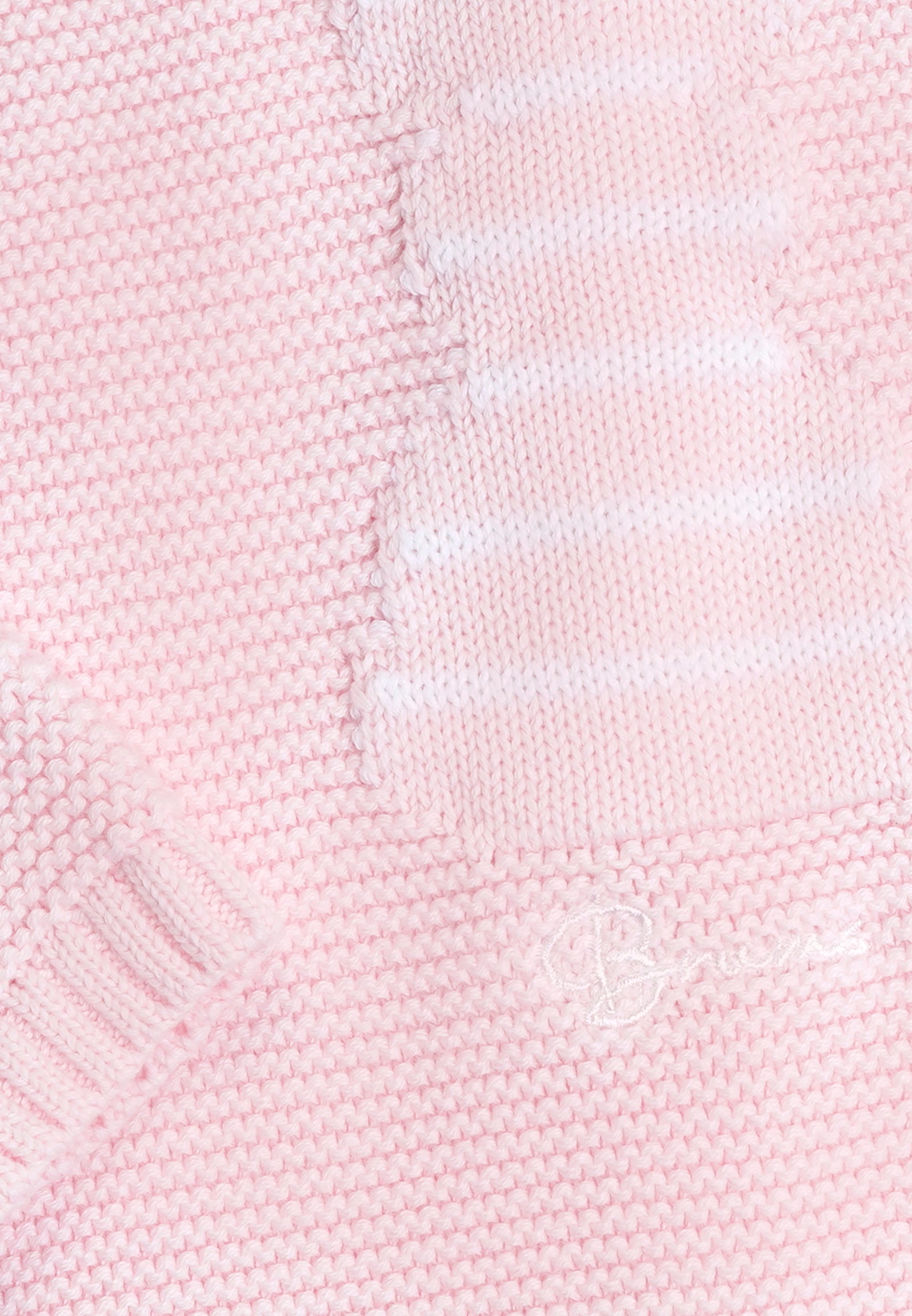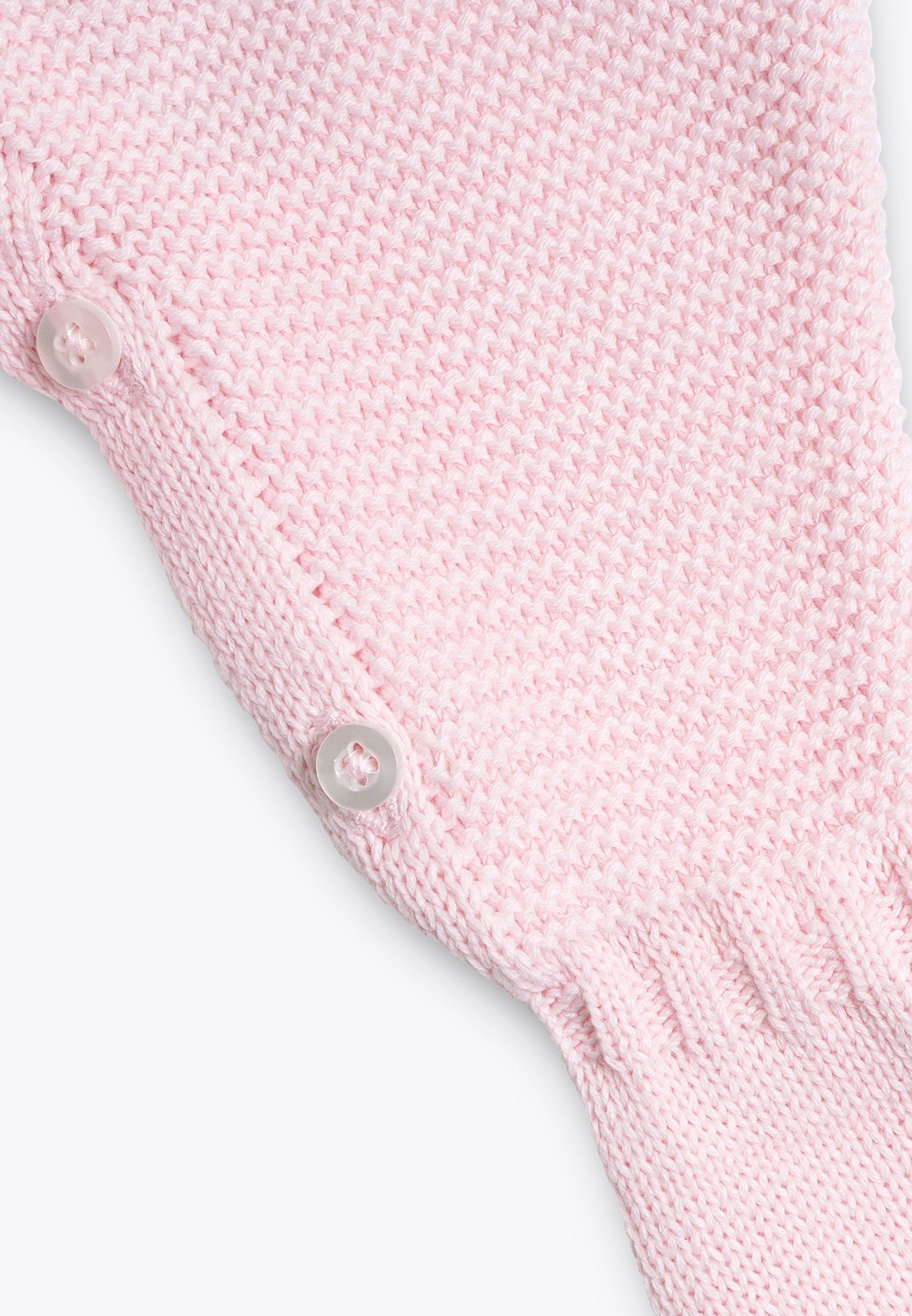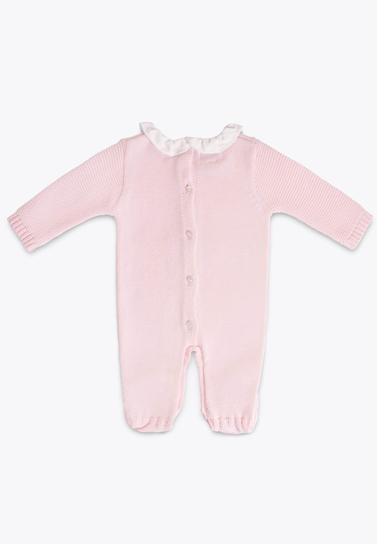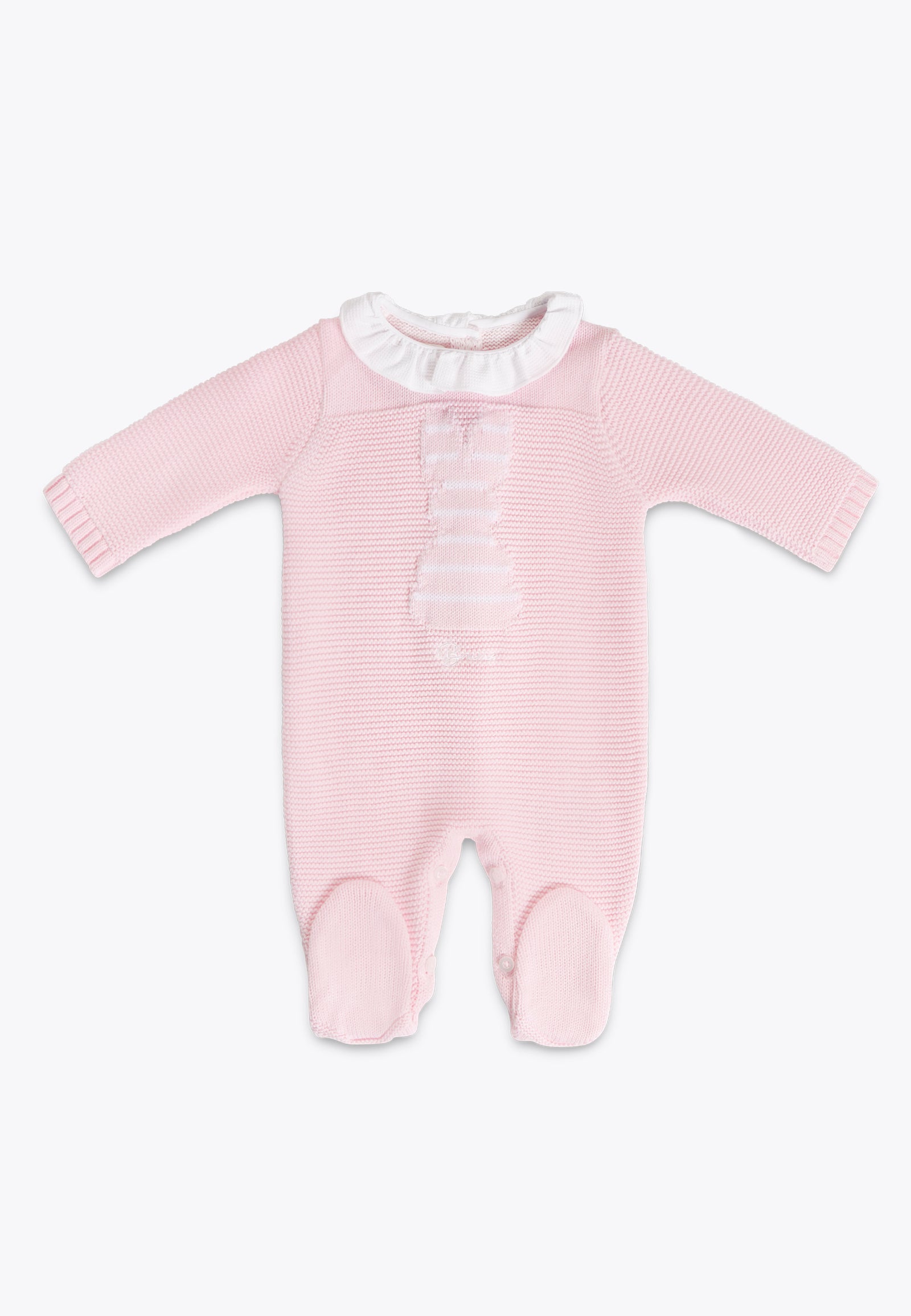 Tutina rosa: giro collo con smerlo, lavorazione a punto rovescio, carré in maglia rasata, polsini in costina, intarsio jacquard con coniglietto a righe e ricamo Brums, apertura sul retro e sul cavallo con bottoni ad asola in imitazione madreperla