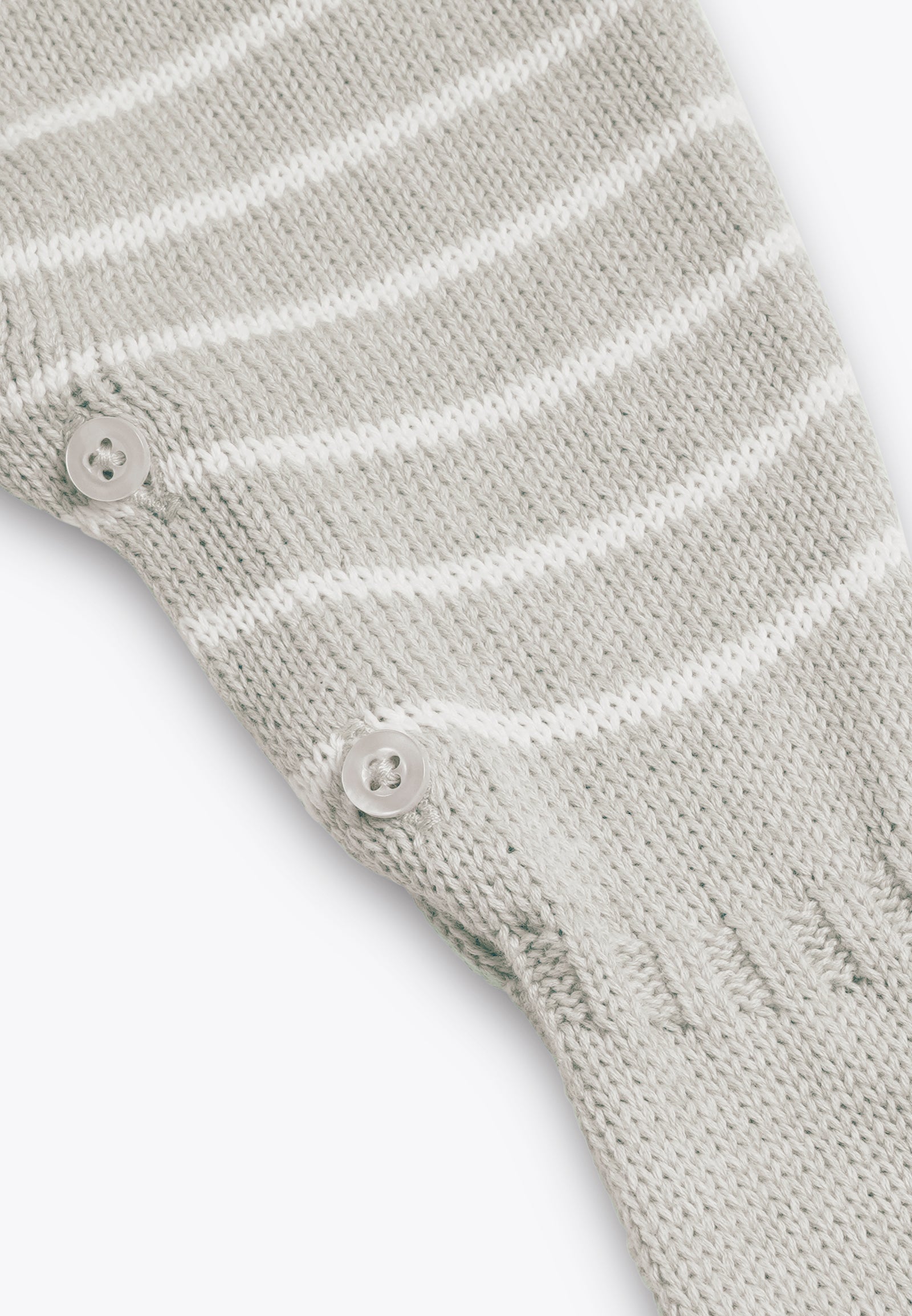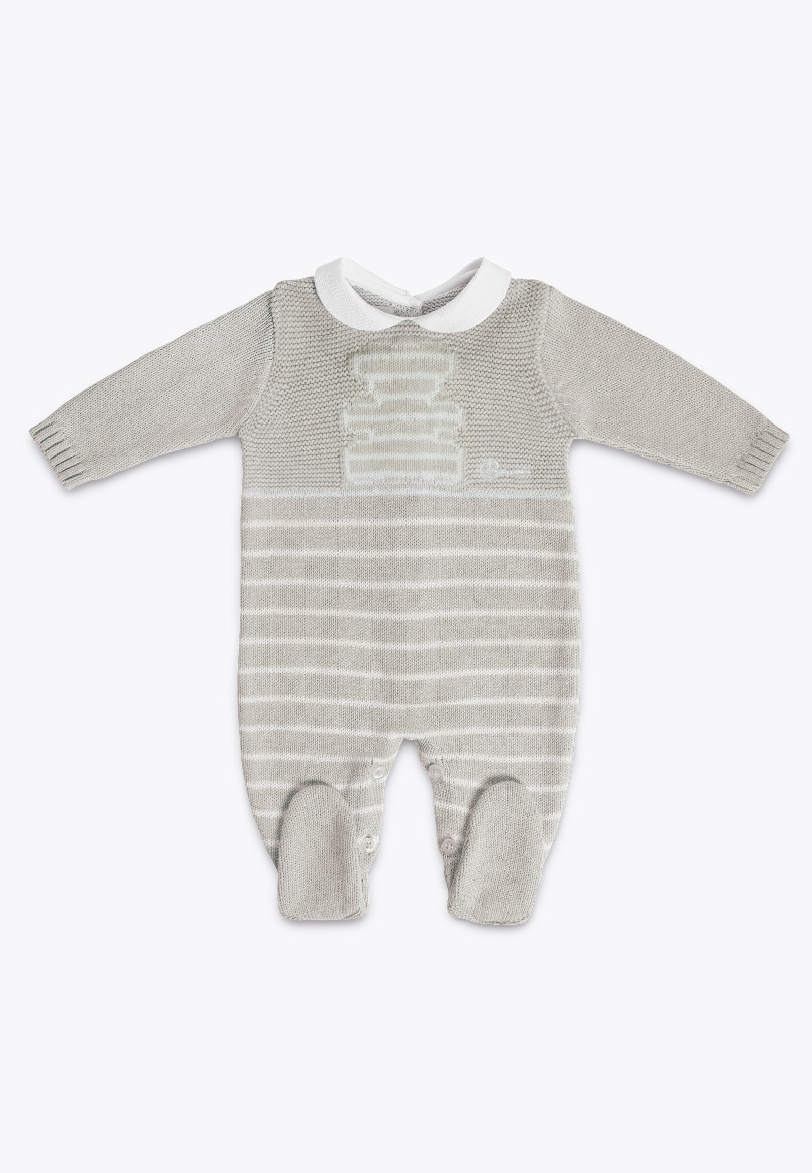 Tutina beige (unisex): giro collo Peter Pan, lavorazione in maglia rasata, polsini in costina, intarsio jacquard con orsetto a righe e ricamo Brums, apertura sul retro e sul cavallo con bottoni ad asola in imitazione madreperla