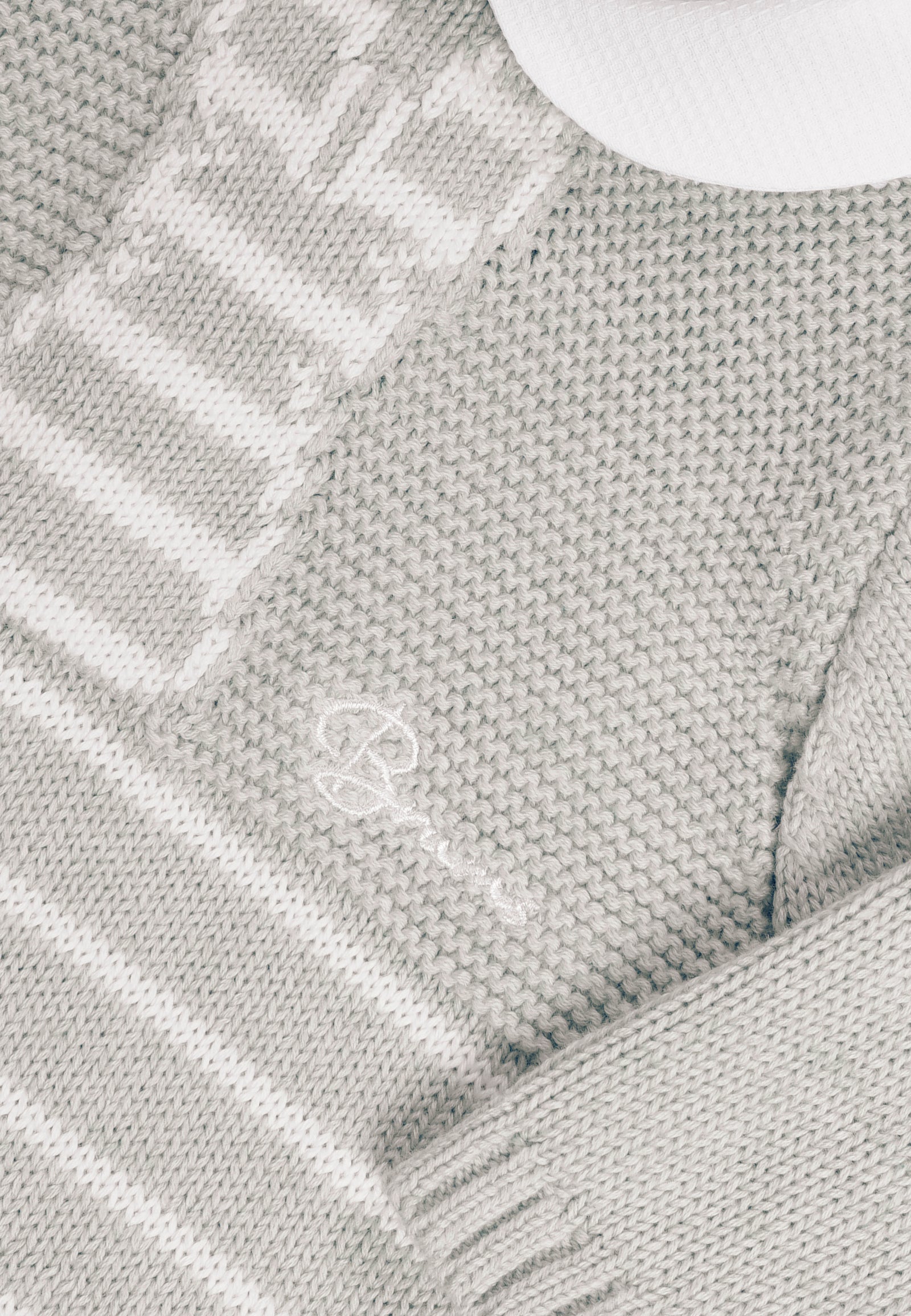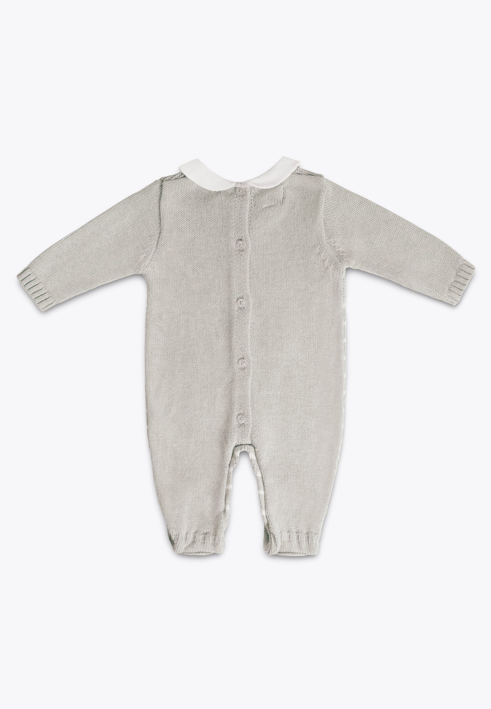 Tutina lavorata a maglia. Una tutina intera pensata da adattare a tutti i gusti e stili in puro cotone Made in Portogallo. Le lavorazioni a grana di riso conferiscono movimento e originalità al capo, intrecciandosi con il filato liscio. Ogni variante di colore è caratterizzata da un jacquard personalizzato e da un colletto in tessuto, aggiungendo un tocco di stile e raffinatezza. Disponibile in rosa, azzurro melange e beige (unisex).